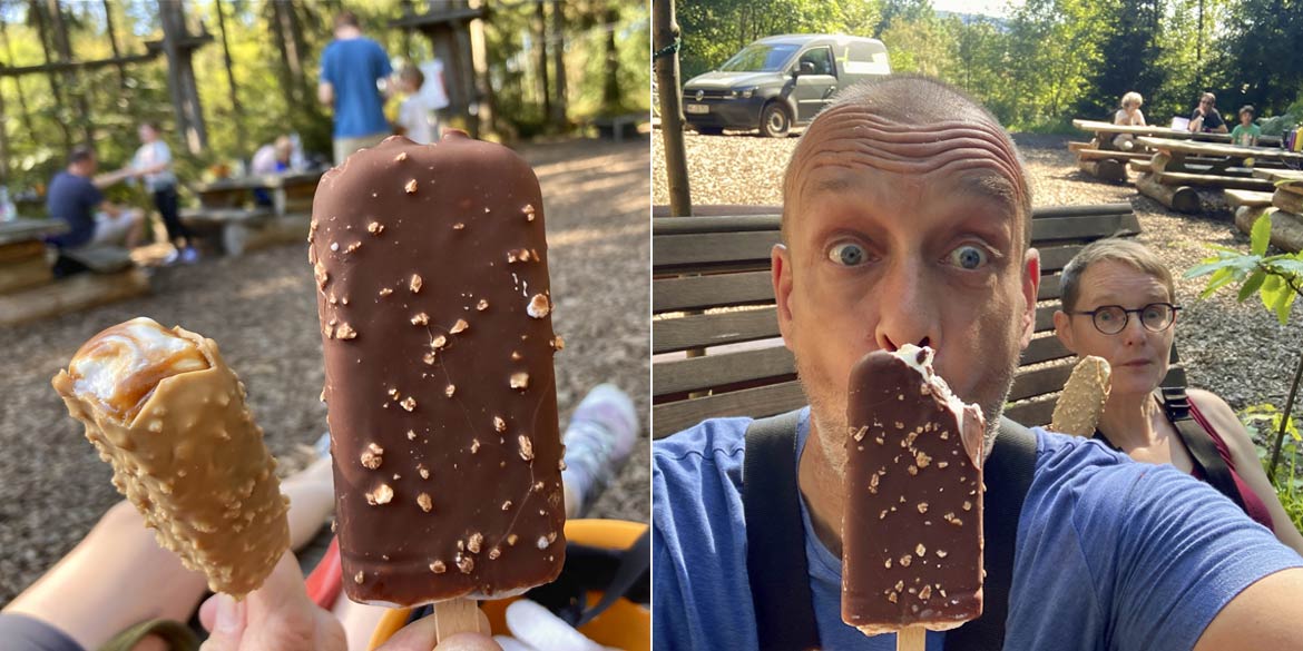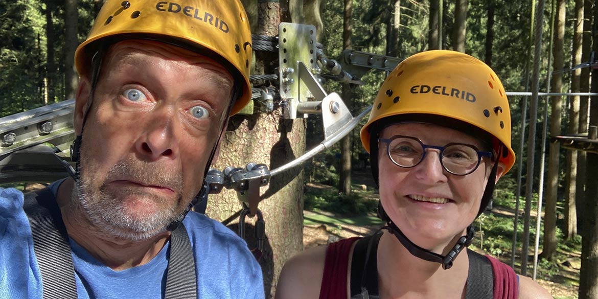 Bei großartigem und spätsommerlichem Septemberwetter war schon die vormittägliche Anfahrt ins malerische Weserbergland eine Freude. In der Nähe von Holzminden lag unser Ziel, eine sehr schöne Anlage im Wald mit sieben einzeln zu kletternden Parcours und einem, der nur partnerschaftlich zu zweit zu bewältigen ist. Sehr nettes Personal versorgte uns mit den nötigen Klettergurten, Handschuhen und Helmen (sehr kleidsam …) und wies uns in die Technik zur Sicherung ein. Und los! Wir beiden – buchstäblich – alten Haasen (wir können es nicht anders schreiben) haben es ruhig angehen lassen und ganz „brav“ mit Parcours Nummer eins begonnen, um uns in steigenden Schwierigkeitsstufen bis ganz nach oben zu arbeiten. Stefanie, deren Idee das Klettern gewesen war, ging frisch und beherzt zur Sache, Daniel zog aber trotz seiner Höhenangst motiviert und sehr gut mit. Wir mussten allerdings beide beobachten, dass sämtliche anwesenden Kinder deutlich flotter und leichtfüßiger unterwegs waren als wir. Aber egal, es zählt der Moment und lass die erstmal älter werden … Ein klitzekleines Eis zur Stärkung zwischendurch hat der Moral aufgeholfen. Und im Lauf des frühen Nachmittags hatten wir alle acht Parcours geschafft, einige gewagte Klettereien bewältigt, zu zweit sehr gut den achten Parcours durchlaufen und so manche Seilrutsche genossen.