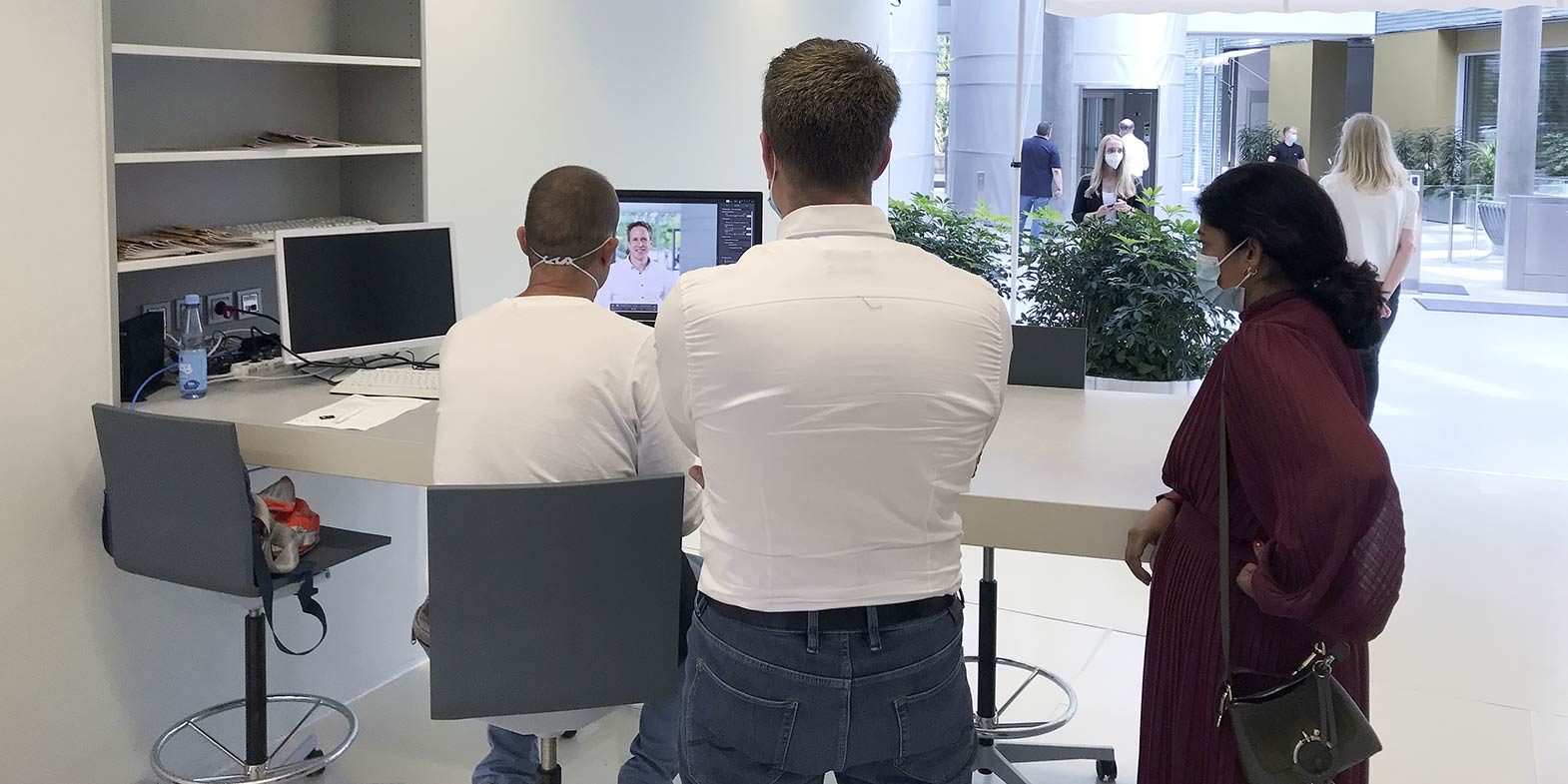 Für unseren langjährigen Kunden VHV Allgemeine Versicherung AG haben wir ExpertInnen verschiedener Themen der VHV-Versicherungswelt für die Bebilderung von Podcasts fotografiert. Im Atrium konnten wir zwei getrennte Arbeitsplätze für den Vormittag aufbauen: im einen Bereich das Fotoset und nebenan Laptop und Monitor, um gleich vor Ort die Bildauswahl mit den fotografierten Personen vorzunehmen. Es sollten zum einen eher klassische Einzelportraits, zum anderen Interviewsituationen entstehen.