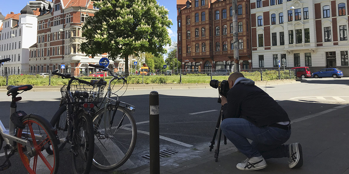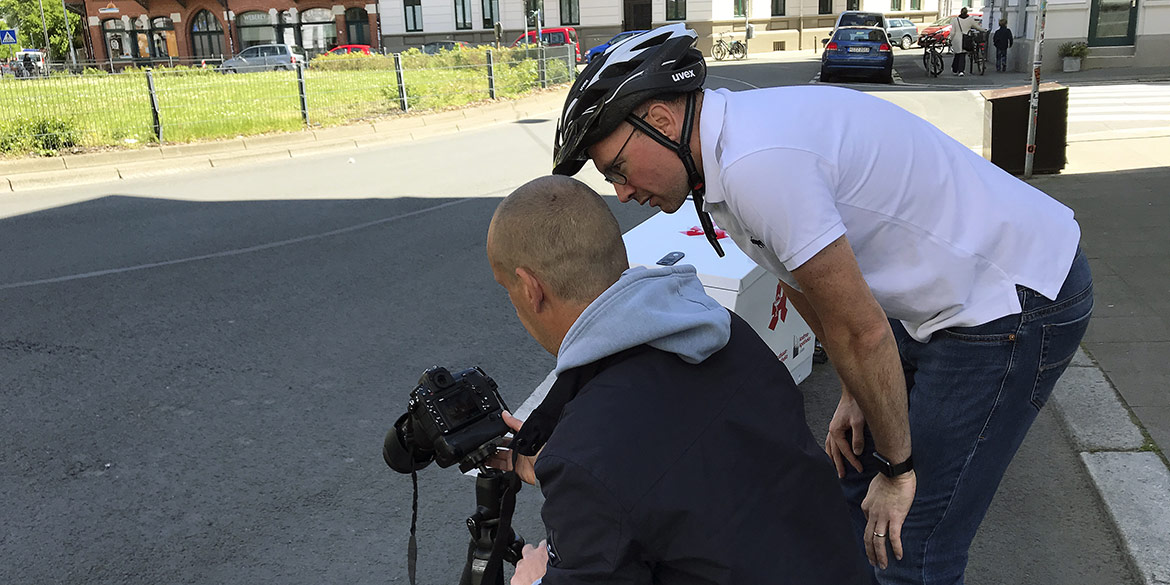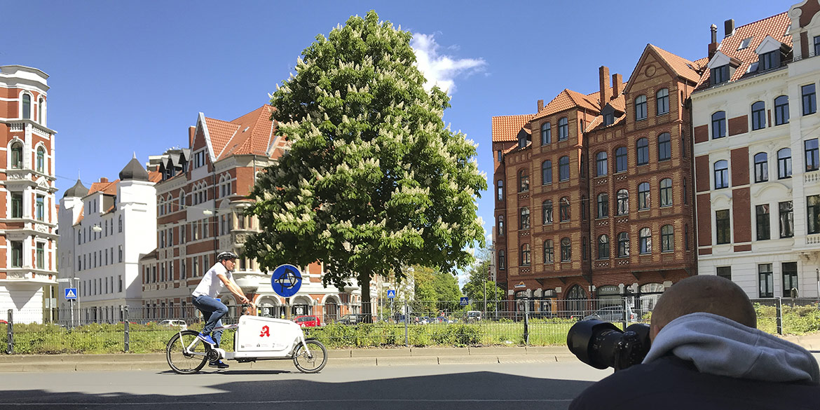 Ein strahlender Sonnentag Mitte Mai, das war der perfekte Rahmen für ein kleines Shooting gleich um die Ecke. Am Lichtenbergkreisel in Linden-Mitte schickten wir den Herrn Dr. Nassimi, Besitzer von drei Lindener Apotheken und einem Lastenrad, in den „Ring“, um dynamische Aufnahmen seines fahrbaren Untersatzes zu machen. Das schicke Lastenrad dient dem Apotheker unter anderem zum Ausfahren von Medikamenten und ist seit kurzem fester Bestandteil der Apotheken-Ausstattung. An diesem Tag durfte Herr Nassimi immer nur im Kreis fahren, machte dabei aber eine ausgesprochen gute Figur. Schnell noch mal das Outfit gewechselt und wieder in die Runde … und nach einer guten Viertelstunde war schon alles im Kasten.