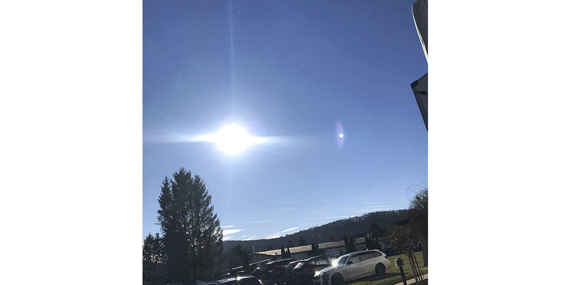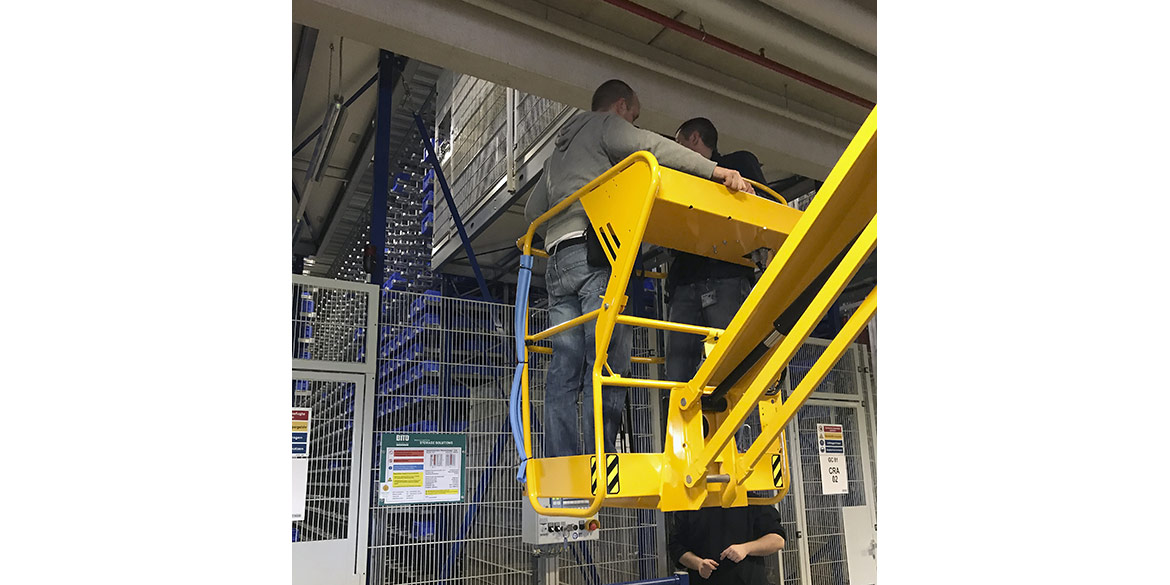 Nach dem Mittagessen blieb noch ein wenig Zeit, kurz vor die Tür zu gehen und die warme Sonne zu genießen, die sich nach Wochen mal wieder blicken ließ. Doch bald rief die Arbeit wieder und es ging weiter, zurück in die Lagerhalle. Dort begann auch gleich das Highlight des Tages: riesige Roboter, die zwischen hohen Regalen langdüsen und Ware einsortieren, ein faszinierendes Schauspiel! Da sich die Roboter aus Sicherheitsgründen hinter hohen Zäunen befinden, musste Daniel samt Kamera und Stativ mit einer Hebebühne raufgefahren werden, um den Zaun nicht mit ins Bild zu bekommen.