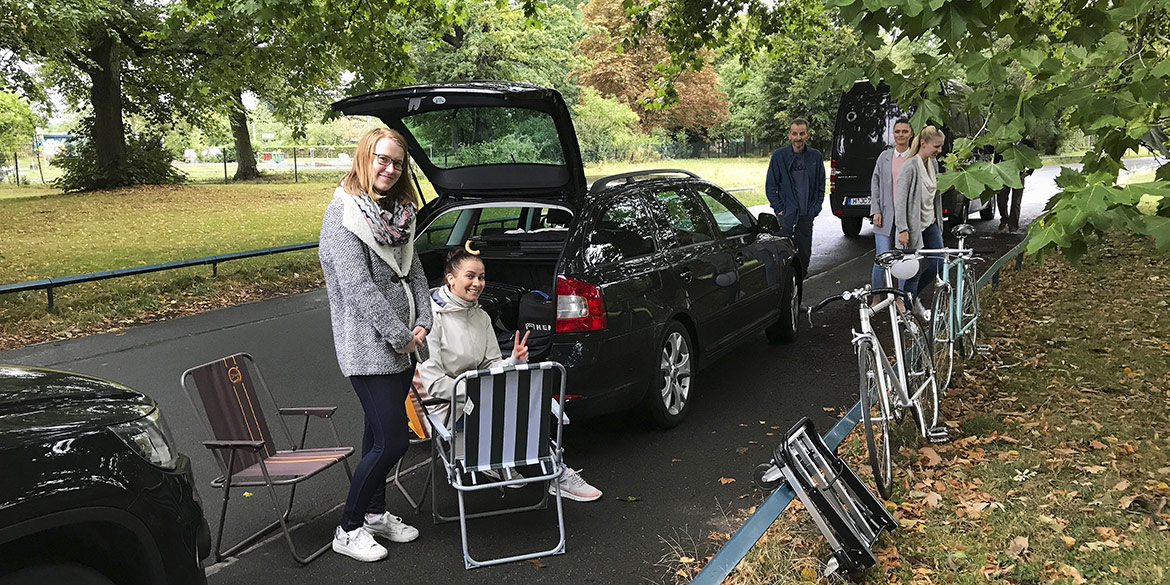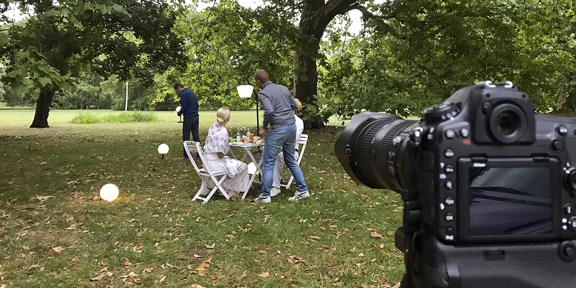 Nach zwei Tagen Pause stieg schon das nächste Shooting. Wir fanden unsere Location im Georgengarten. Die Wetterlage sollte zumindest in den Abendstunden mitspielen – das reichte. Die Vorbereitungen liefen ähnlich wie zwei Tage zuvor, wir präparierten nur andere Requisiten für andere Situationen. Ein weißer Gartentisch mit allerhand leckeren Speisen stand bereit, zwei Fahrräder warteten auf unsere Modelle, die Picknickdecke samt Schachspiel war vorbereitet. Nachdem Daniel im nahe gelegenen „Café Steintormasch“ einen Fünfer gelassen hatte, durften wir dort für den Rest des Abends unendlich oft das Klo benutzen – sehr praktisch.