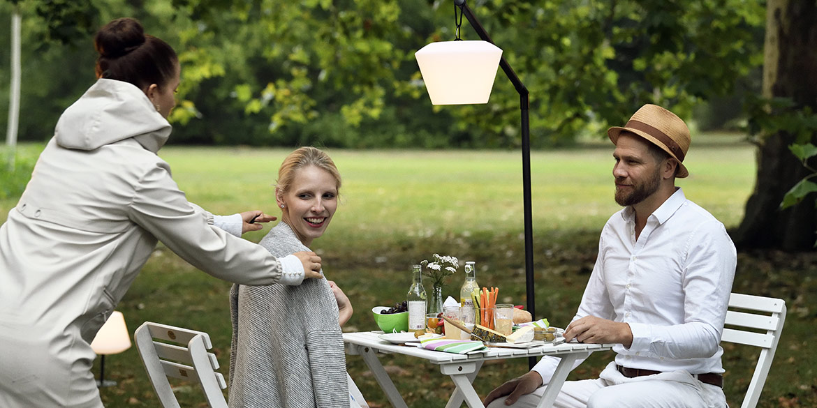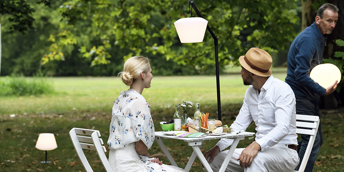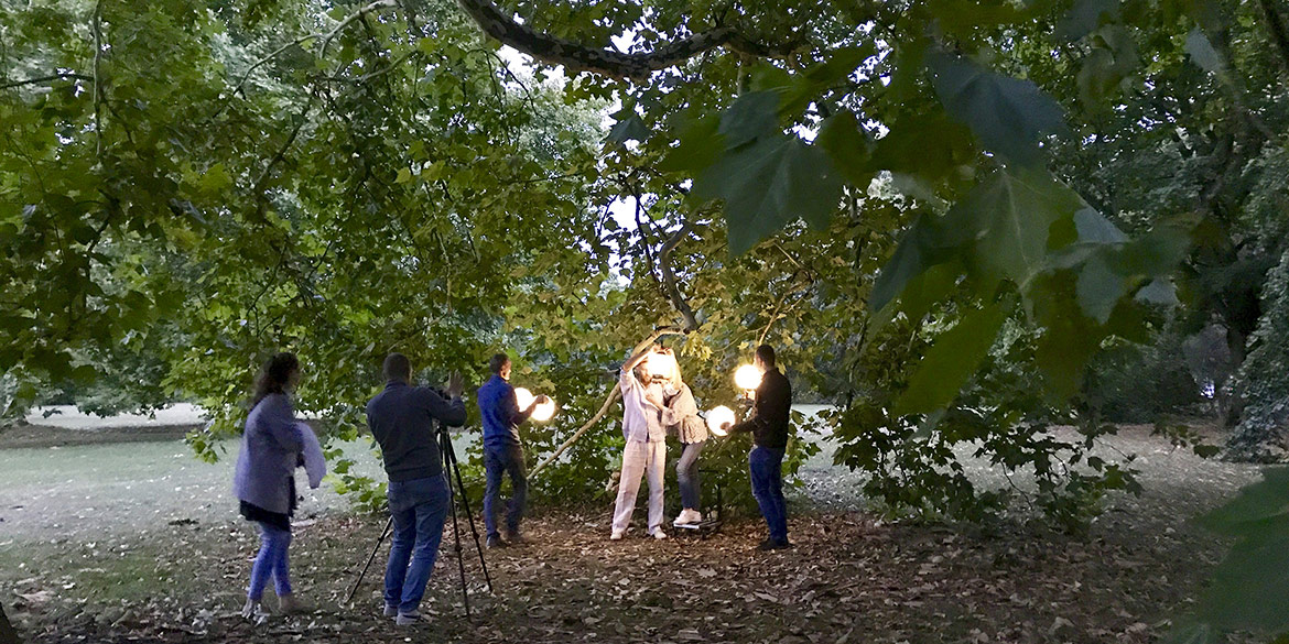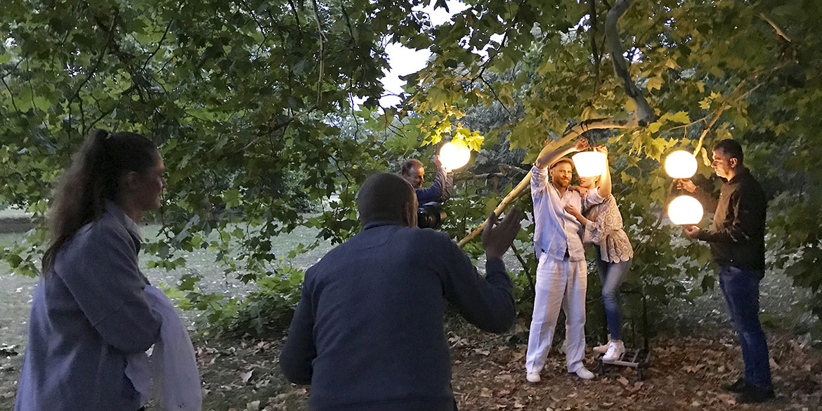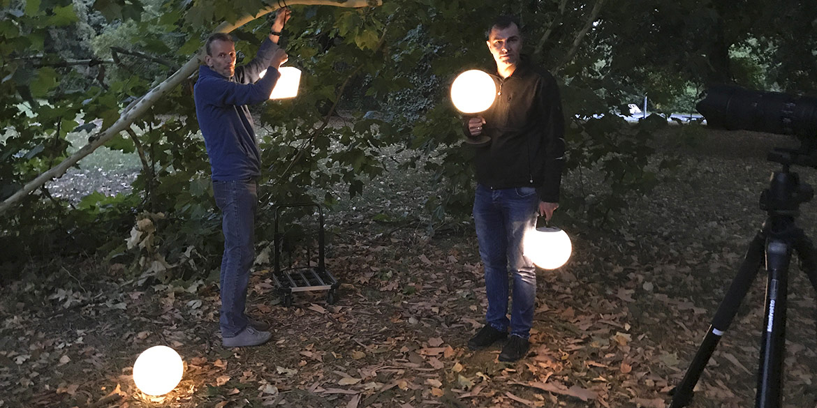 Das DMF-Team, bestehend aus Daniel, Sandra und Lisa, stellte Lampen auf und richtete diese ein. Wir machten Stellproben für die Modelle und warteten auf den einen Moment: den Untergang der Sonne. Denn wie könnte man besser portable Akkulampen „outdoor“ fotografieren, als in der blauen Stunde?