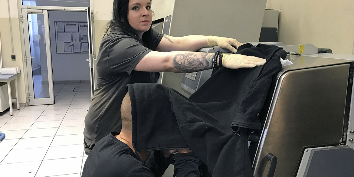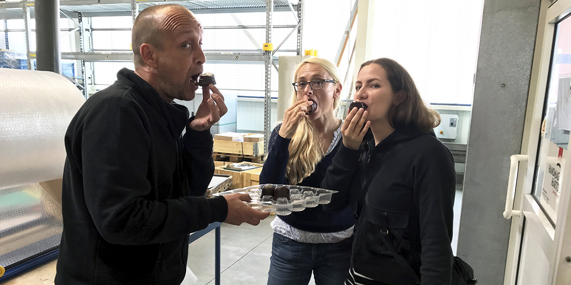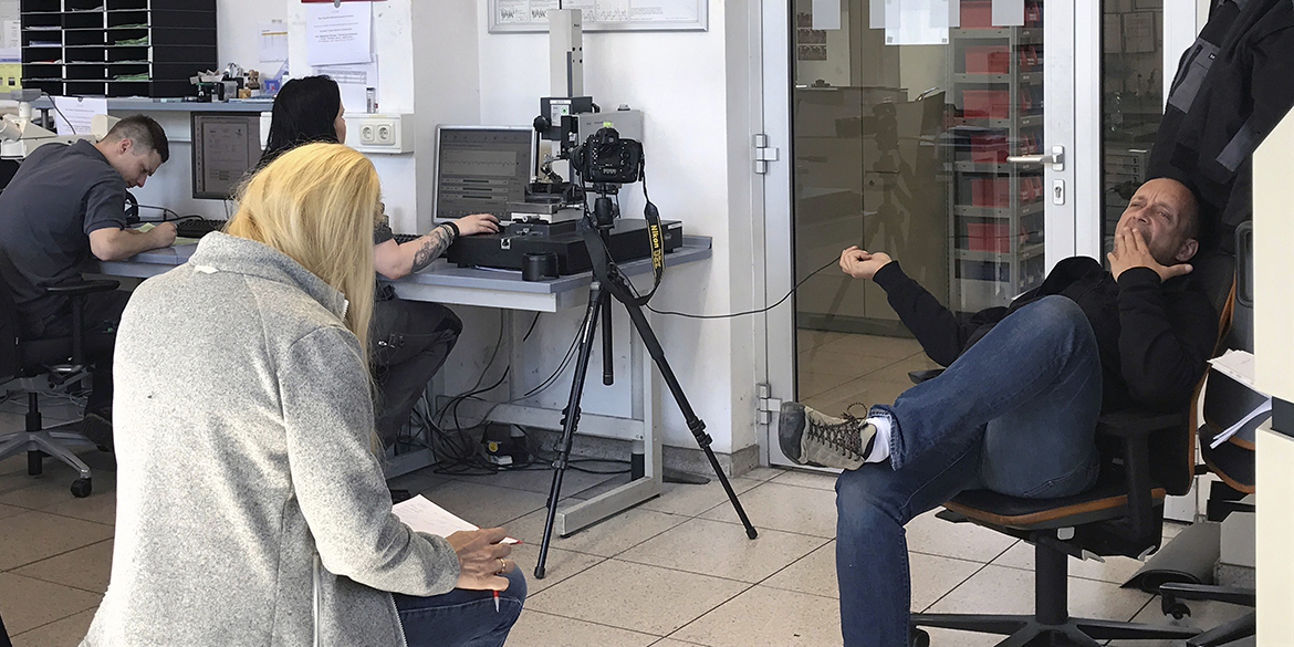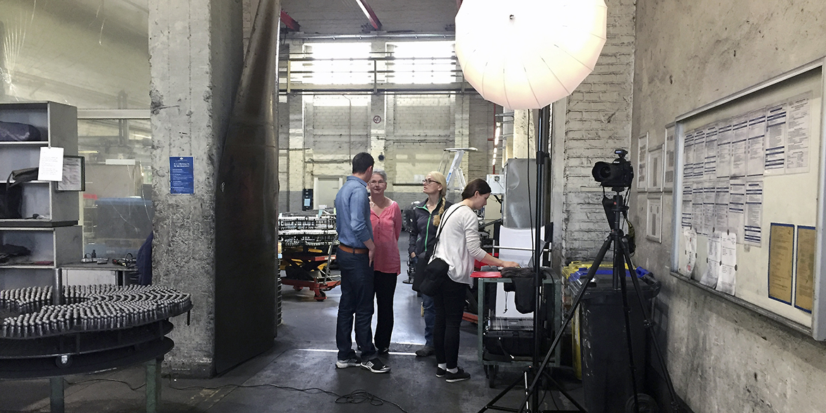 Am nächsten Morgen standen wir schon wieder früh in der Werkshalle und brachten die letzten Motive in den Kasten, bevor wir mittags zum Standort Berlin weiterreisten. Essen gab es unterwegs an einer Raststätte: lecker Bockwurst. In Berlin angekommen, machten wir noch eine Werksbegehung, um unsere Motivliste für die nächsten Tage zusammenzustellen. Über den langen Arbeitstag war das Trinken völlig zu kurz gekommen. Deswegen trieb der Durst Sandra und Daniel aus dem Hotel zu einem angrenzenden Supermarkt, und beide schaufelten sich die Arme mit Getränken voll. Erst vor der Tür beim Betrachten der eingekauften Menge wurde ihnen richtig bewusst, wie groß der Durst geworden war.