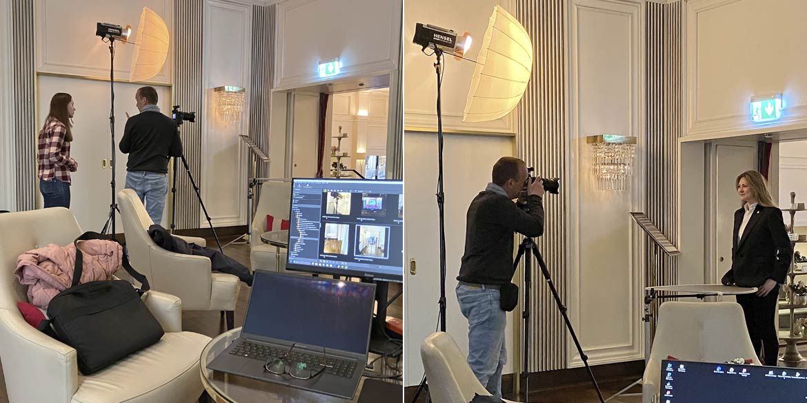 Der Tag begann für mich um kurz vor neun Uhr morgens direkt beim Hotel – ich kam mit der Straßenbahn, Daniel und Stefanie mit dem Auto. Als erstes packten wir alle an, um das Foto-Equipment ins Hotel zu transportieren. Dort ging es dann direkt mit dem Mitarbeiterportrait im Foyer los: Wir bauten das Set auf und Daniel fing mit dem Fotografieren an. Dann suchten wir mit der fotografierten Mitarbeiterin das Portrait aus und machten uns anschließend auf in den ersten Stock, um mehrere Zimmer und auch eine Juniorsuite zu fotografieren. Sobald Daniel seine Kamera und Stefanie das Laptop aufgebaut hatte fing Daniel an, die Zimmer aus verschiedenen Blickwinkeln zu fotografieren. Dank der sehr gut vorbereiteten Zimmer ging das eigentliche Fotografieren sehr schnell. Allerdings ging es dabei um viele kleine Details: Sieht man das Kabel unter dem Tisch? Stehen die Flaschen auf den Nachttischen gleich? Ist der Kosmetikspiegel auch gut zu sehen, und spiegelt sich darin nichts Ungewolltes? Wo soll die Orchidee stehen? Und und und … Ich guckte durch die Kamera während Daniel die Details positionierte, bis alles stimmte. Außerdem war es meine Aufgabe, Stefanie die Speicherkarten zu übergeben und zusammen die Fotos anzuschauen, um die Details zu kontrollieren. Schnell fanden wir in einen Rhythmus, durch den wir gut als Team arbeiten konnten. Wir waren alle sehr konzentriert bei der Sache, so konnte ich mich schnell einfügen.