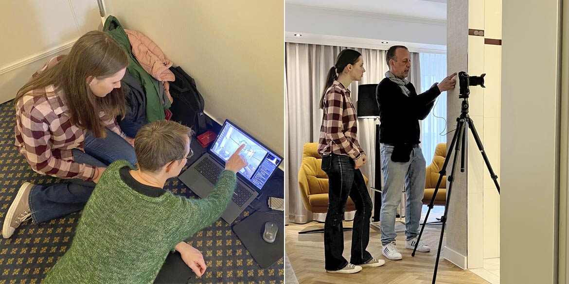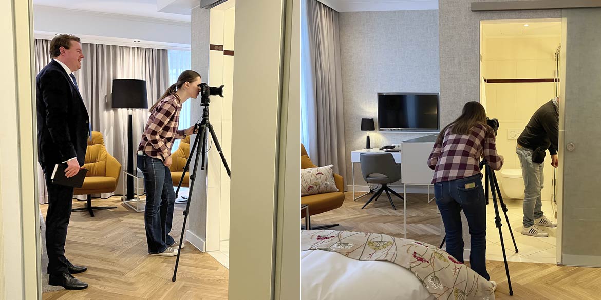 Wie vor der Mittagspause arbeiteten wir weiter und zogen schon bald in den dritten Stock, in dem wir noch ein Zimmer und eine weitere Juniorsuite fotografieren sollten. Wieder im gemeinsamen Rhythmus durfte ich sogar einmal den Auslöser der Kamera drücken. Dadurch, dass ich mich schnell eingelebt hatte und wir gut im Team reagierten, konnte ich schnell eine Unterstützung für Daniel und Stefanie sein, was mich sehr freute. Und bald hatte ich auch einen Blick auf die Details gefunden, den ich vor meinem ersten Praktikumstag noch nicht hatte.