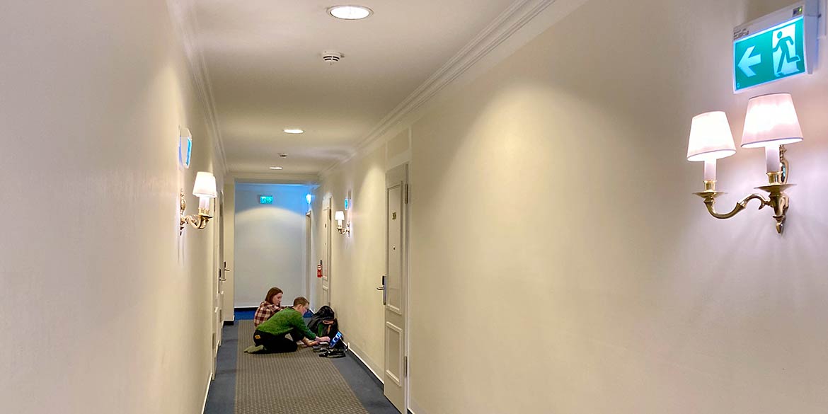 Irgendwann klopfte bei uns allen der Hunger an und wir machten uns auf in die Hotelbar und stärkten uns durch Currywürste und Veggie-Sandwich. Durch das sehr leckere Essen und den schnellen Service fühlten wir uns schnell wieder voller Energie und machten uns bald wieder in den ersten Stock auf – denn es warteten noch vier weitere Zimmer auf uns, die fotografiert werden wollten.