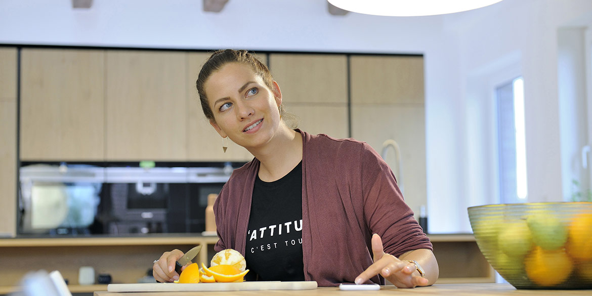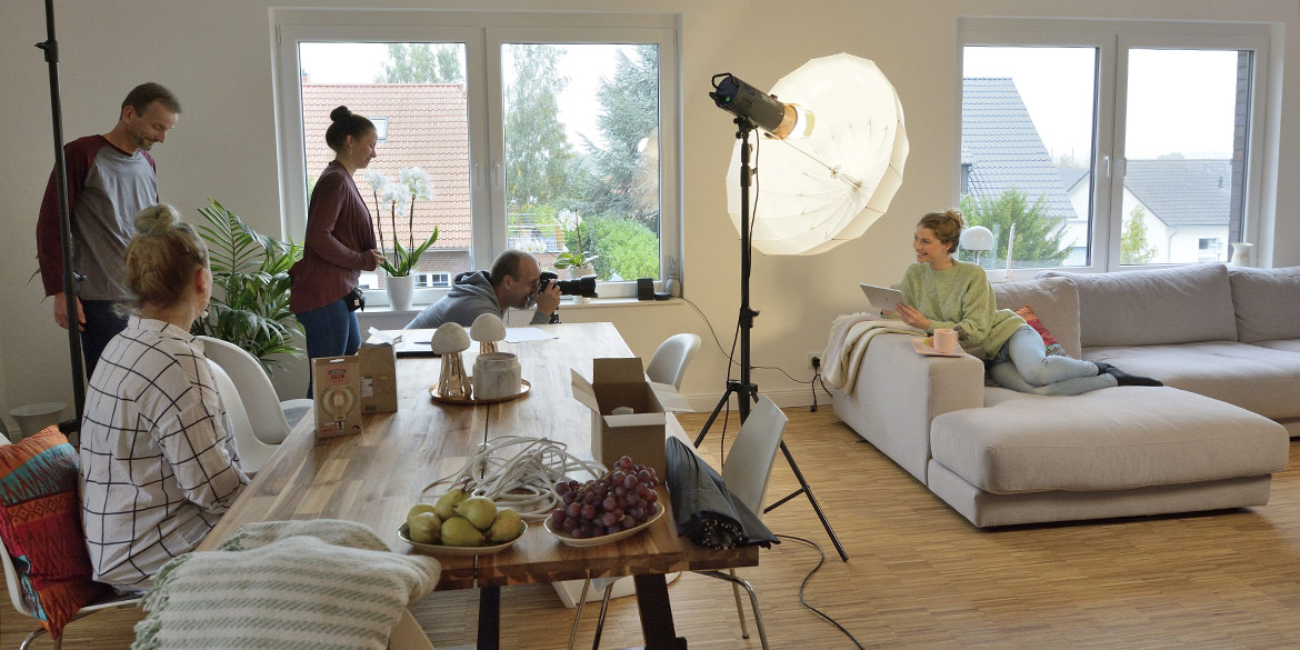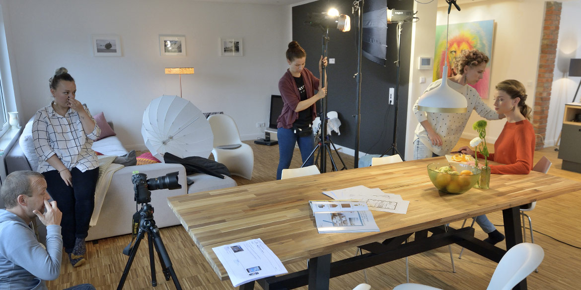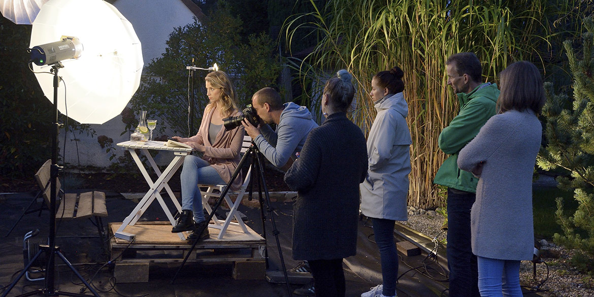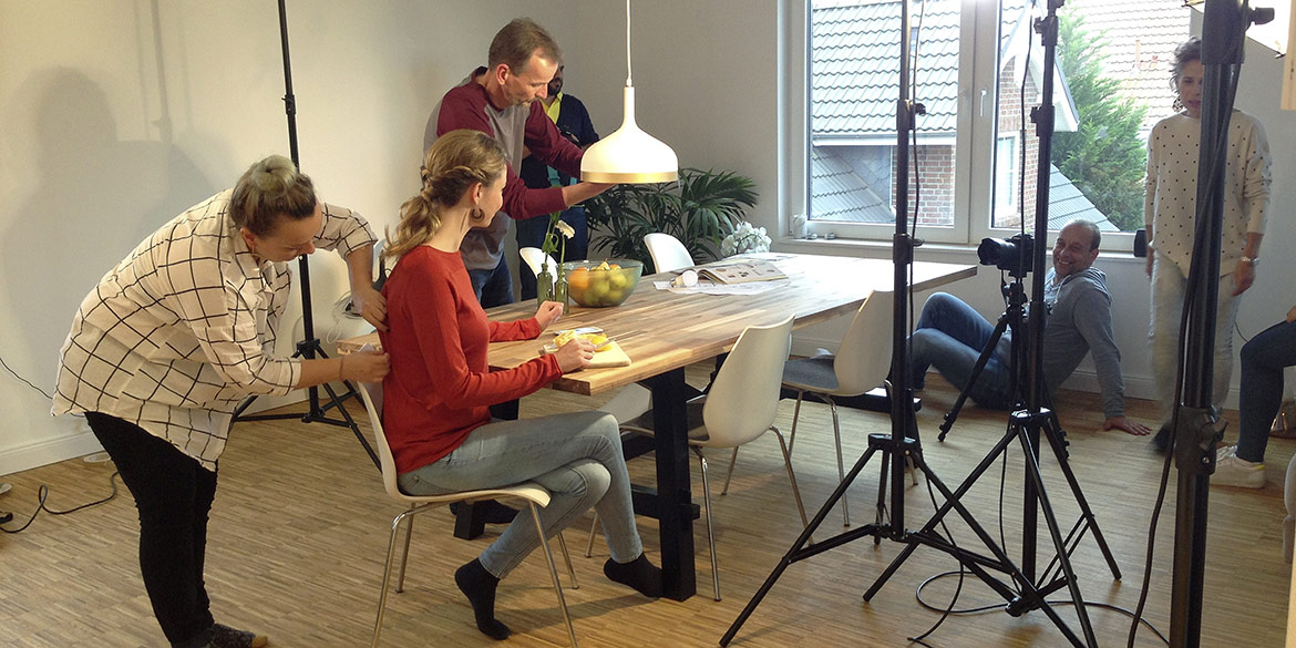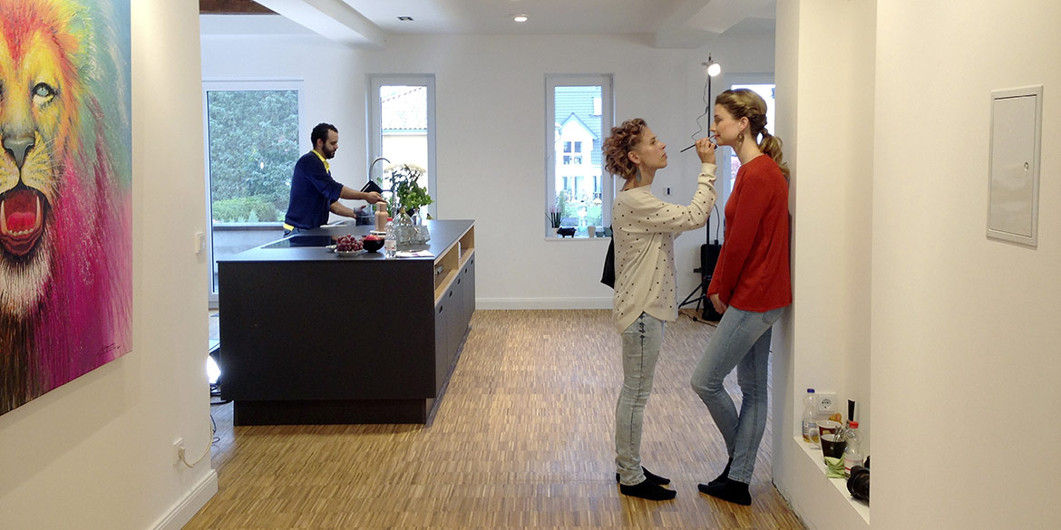 Mit leichter Verspätung starteten wir also mit den Aufnahmen. Das ganze Team arbeitete ad hoc so konzentriert zusammen, dass wir nach einigen Szenen der langen To-do-Liste wieder in den Zeitplan kamen. Hausherr Armin – selbst leidenschaftlicher Freizeit-Fotograf – wurde für die Making-of-Aufnahmen verdonnert und lieh sich dafür ein Weitwinkel-Objektiv von uns aus. Das ging nur, weil er selbst auch mit Nikon unterwegs ist: Daumen aber sowas von hoch! Stefanie kümmerte sich um das Datenhandling, war für viele Wünsche ansprechbar (für das Modell sogar auf Niederländisch) und versorgte zwischendurch alle mit Brötchen, Gebäck und reichlich Vitaminen.