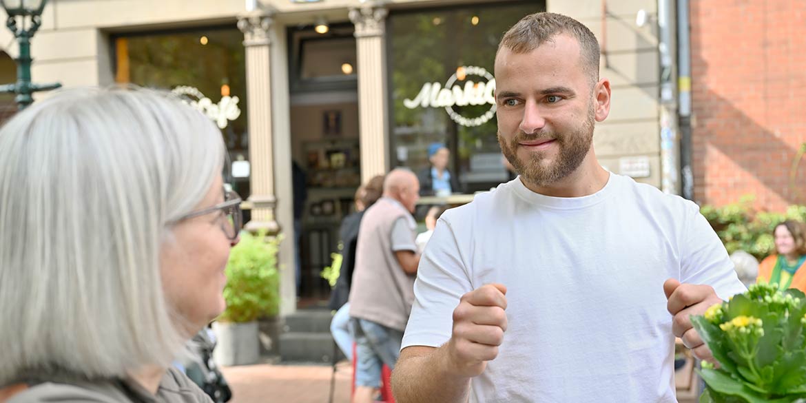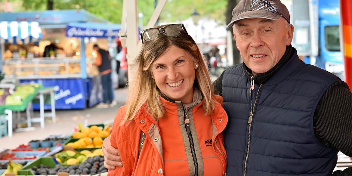 Erstaunlich übrigens, wie viele Menschen Daniel kennt, die morgens schon in Linden unterwegs sind. Schon gleich früh im Park lief ihm die erste Bekannte mit ihrem Hund über den Weg. Und auch auf dem Markt, also mitten auf dem Lindener Parkett … äh Pflaster, traf er mehrfach auf Freund:innen und Bekannte. Und wer weiß, wer Daniel sonst noch gesehen und nicht angesprochen hat? Alle waren aber verständnisvoll und haben ihn ungestört arbeiten lassen. Ein Dankeschön noch an die beiden Marktleute, die so nett waren, uns an ihrem Stand fotografisch austoben zu lassen.