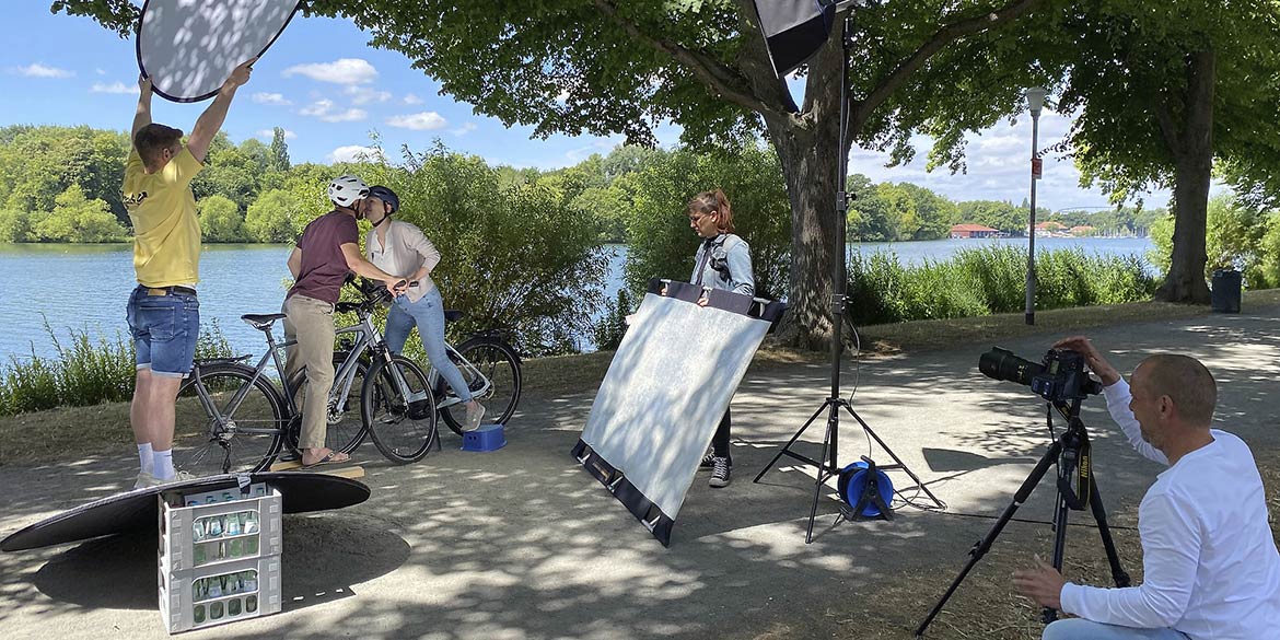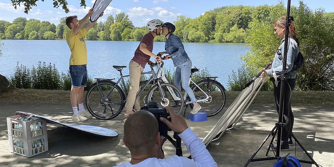 Das war mal die perfekte Anfrage für ein schönes Motiv: Ein Pärchen auf Fahrrädern am Maschsee, die sich gerade küssen. Perfekt schon deshalb, weil das Thema Fahrrad für Daniel (und Team) grundsätzlich sehr persönlich und positiv ist. So fuhr Daniel dann auch gleich als erstes mit seiner Freundin Katja abends per Rad um den Maschsee, um die perfekte Location zu finden und davon Bilder zur Abstimmung zu machen. Perfekt auch, weil der Kunde alles hervorragend und sehr gut strukturiert vorbereitet hatte – inklusive Catering. Wunderbar, wenn alle so gut organisiert an einem Strang ziehen. Und perfekt deshalb, weil das Modell-Pärchen Lisa und James das Shooting quasi als Generalprobe nehmen konnte, denn vier Tage später gaben sie sich ganz offiziell das Ja-Wort.
