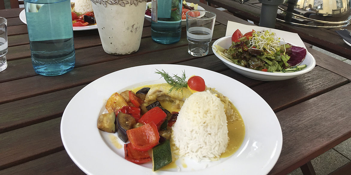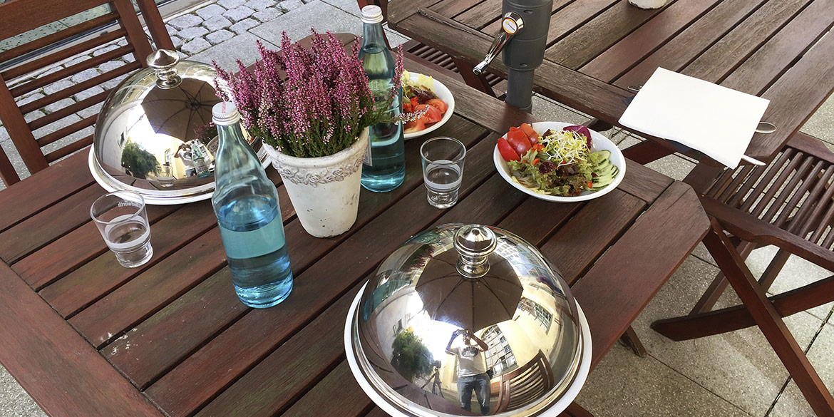 Die Hauptmotive waren zwar erst in der Dämmerung geplant, ausreichend Shootingmotive für die Vormittagsstunden gab es aber trotzdem. Um die Mittagszeit gönnten wir uns eine kleine Pause und wurden von den Köchen des Restaurants „Zwischenzeit“ mit leckerem Essen verwöhnt. Ganz nobel mit Gloschen auf den Tellern, unter denen sich leckerer Fisch verbarg, wurde uns auf der Terrasse schick und exklusiv im Innenhof des Hotels das Essen serviert.
