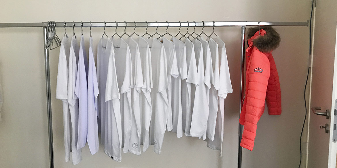 Am Shootingtag waren natürlich alle pünktlich anwesend und als im 1. Stock alle weißen T-Shirts feinsäuberlich von „Supersteamer“ Yaron vorbereitet waren und akkurat auf der Kleiderstange hingen, ging es los. Ganz wie erwartet dauerte es trotz der guten Vorbereitung ein Weilchen, noch Kleinigkeiten auszuprobieren, uns schnell mit dem Kunden abzustimmen und alles fein zu justieren, bis alle glücklich mit den ersten Aufnahmen waren. Danach lief der Tag ganz geschmeidig mit allen fünf Modellen durch.