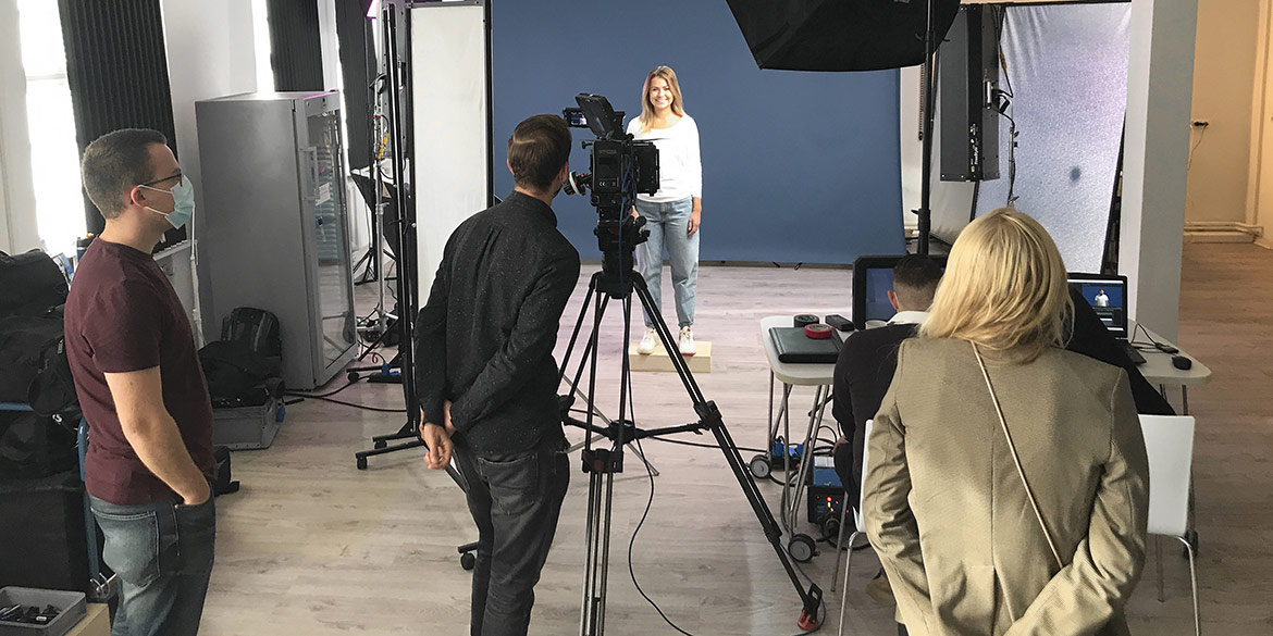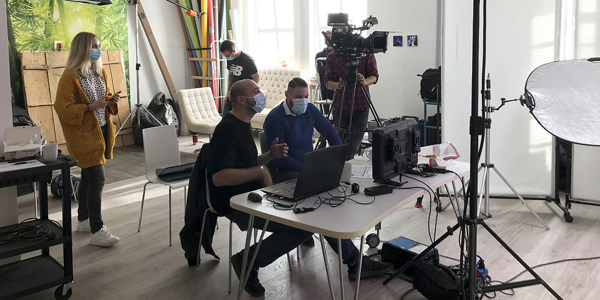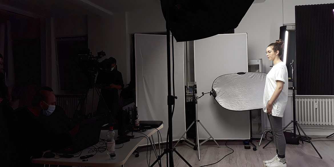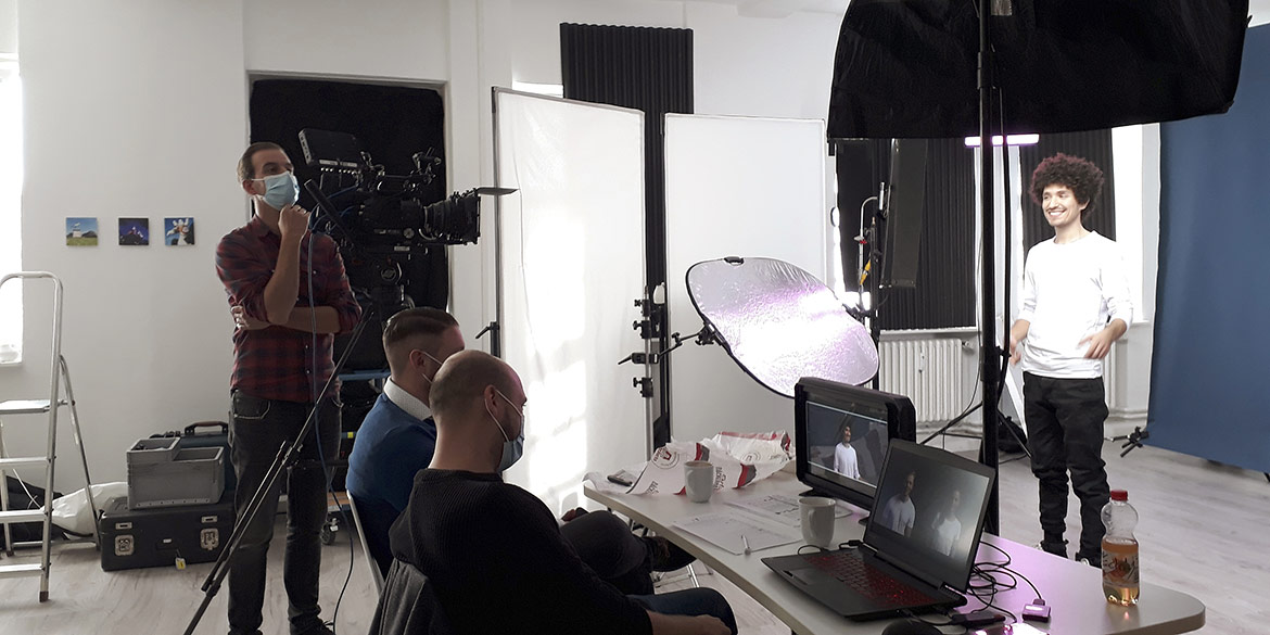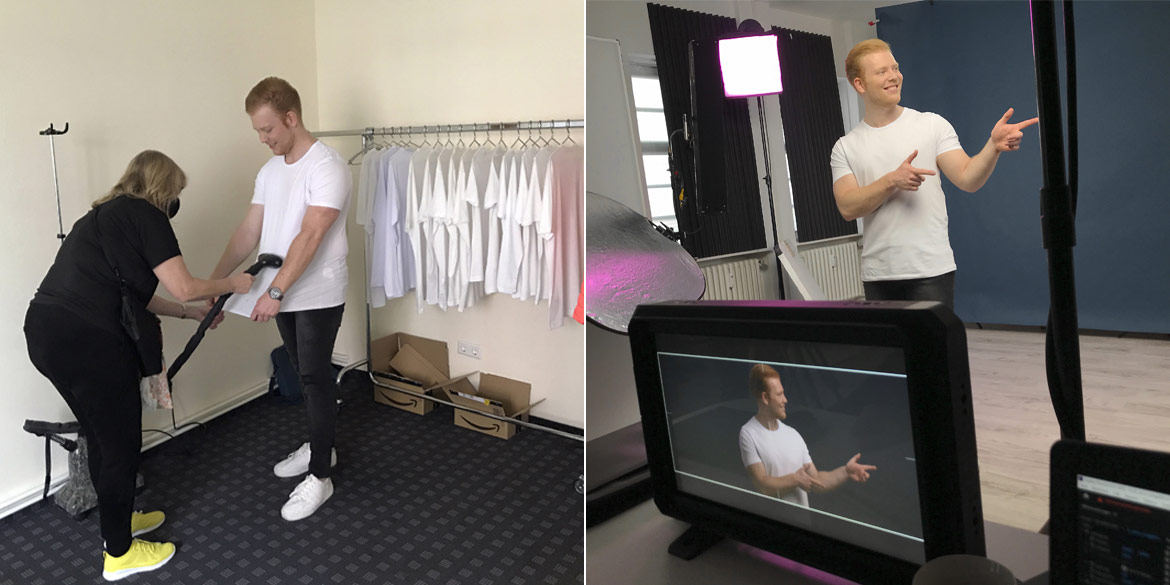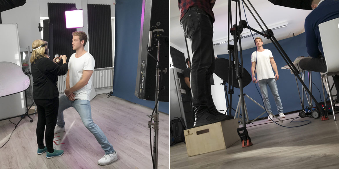 So ging es dann auch am zweiten Tag weiter, bis die Körpergröße eines Modells kurz für Irritation sorgte. Er war deutlich größer als die anderen Modelle und passte einfach nicht in die eingerichteten Sets. Also musste kurz umdisponiert werden, der Kameramann stellte sich zum Dreh auf eine Kiste und im Foto-Set musste das Modell auf einem zusätzlich erhöhten Hocker „stitzen“.