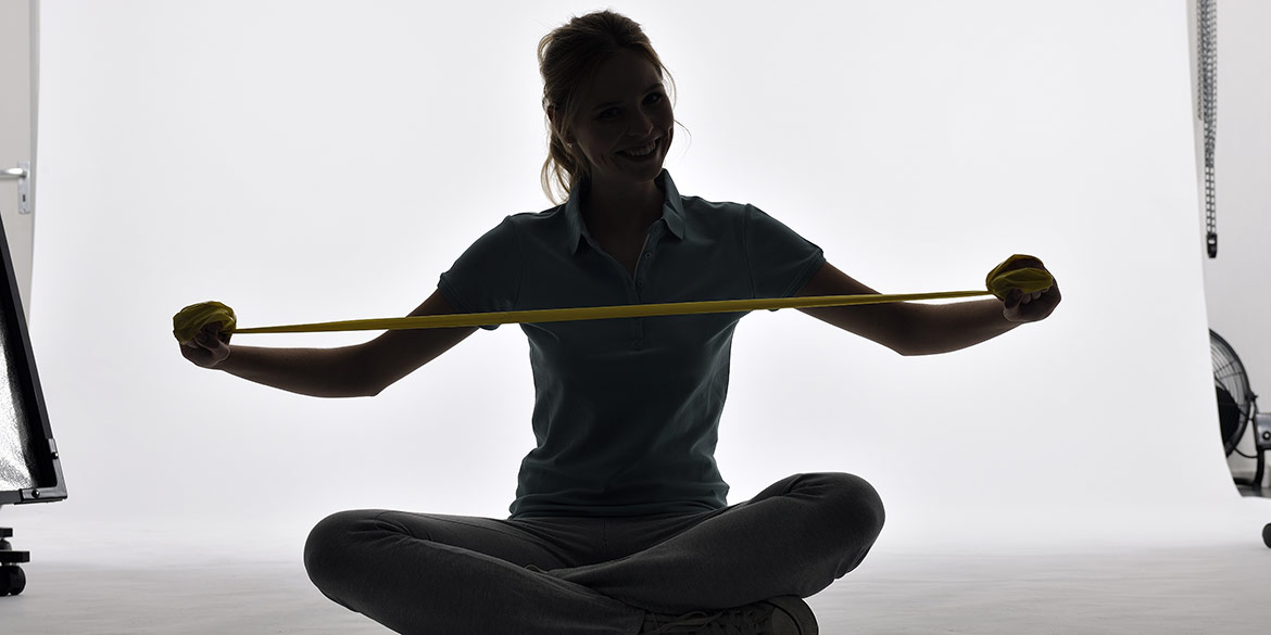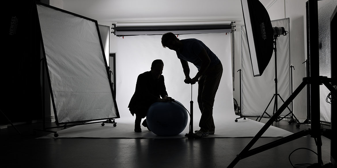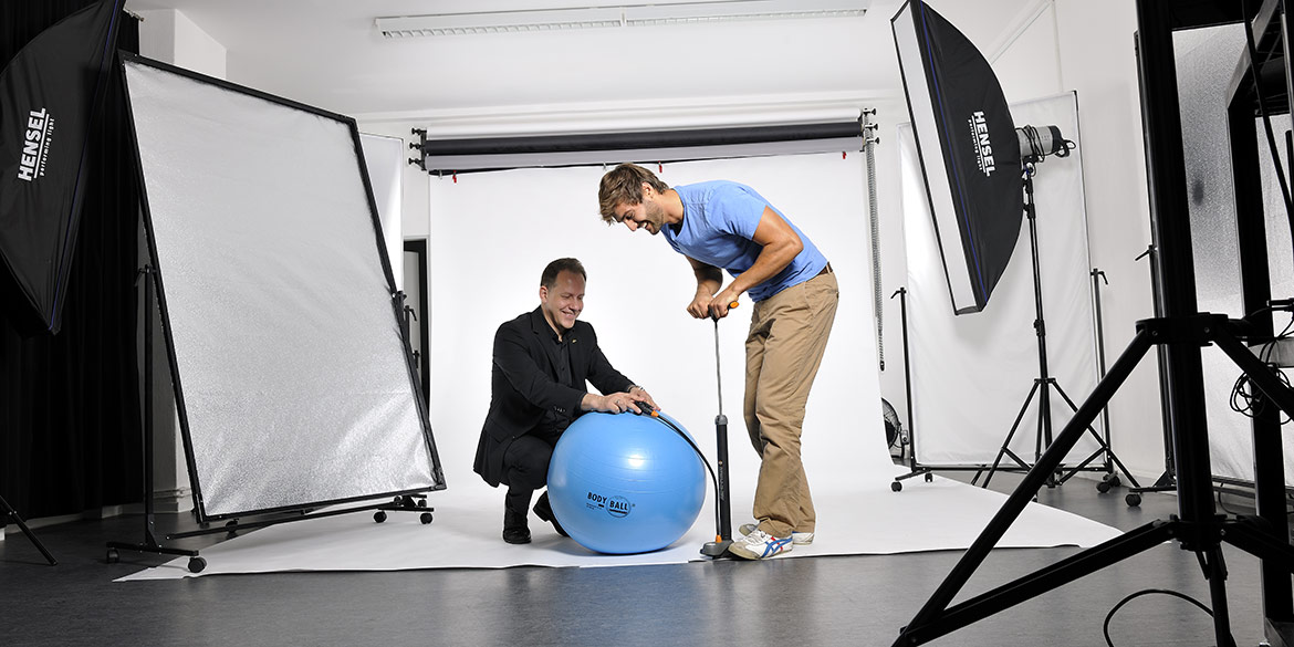 Innerhalb des straffen Zeitplans wurde es sportlich für die Modelle, denn sie schlüpften in die Rolle von Physiotherapeuten. Wir fotografierten sie mit Igelbällen, einem Gymnastikball und Thera-Bändern, an denen Modell Thekla besonderen Gefallen fand. Beim Aufpumpen des Gymnastikballs legten Modell Sami und unser Kunde gemeinsam tatkräftig Hand an.