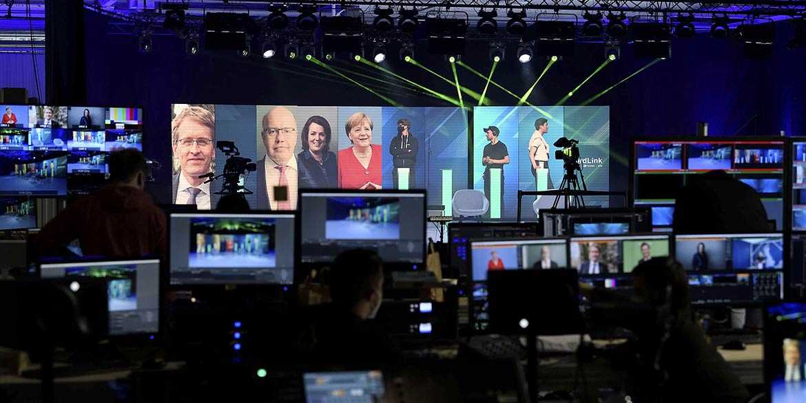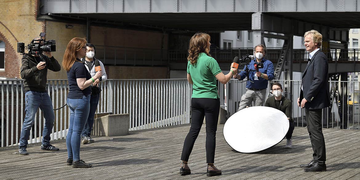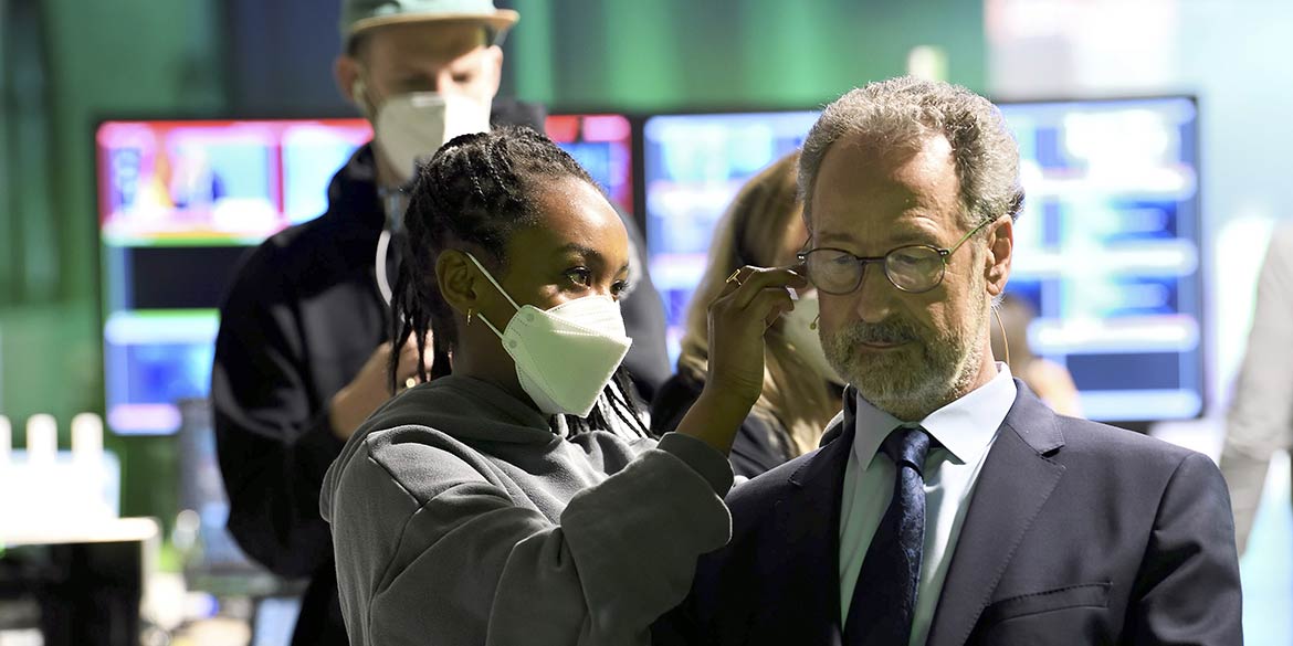 Am Mittwoch gab es als erstes einen Schnelltest und anschließend ein grünes Band für den Arm, um überhaupt arbeiten zu dürfen. Dann wurde das Live-Event sehr konzentriert vorbereitet, damit die „Schaltungen“ am Donnerstag reibungslos laufen würden. Lichtsituationen wurden eingerichtet und natürlich auch Markierungen auf die Bühne geklebt, um die exakten Positionen des Moderators und der LED-Paneele zu fixieren. Wegen Terminen der Politikprominenz musste alles auf die Minute oder genauer durchgetaktet werden. Das alles unter den gegebenen Hygiene- und Abstandsregeln, die natürlich auch auf dem stillen Örtchen einzuhalten waren.