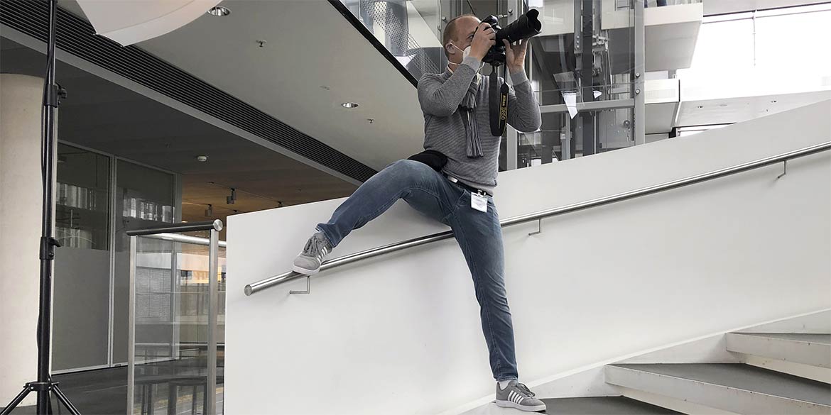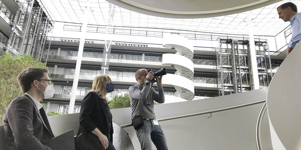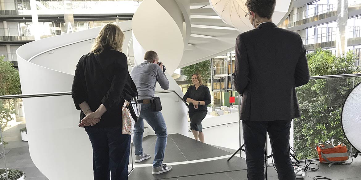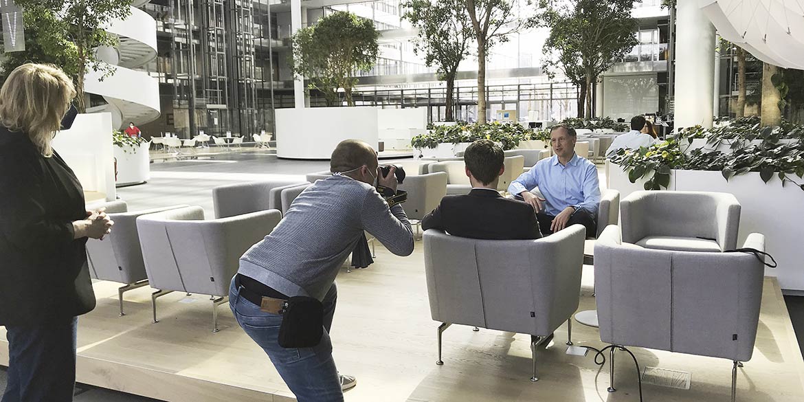 Am zweiten Shootingtag kamen die ersten drei der insgesamt neun Vorstände vor die Kamera. Von Janine etwas für die Kamera „aufgehübscht“, nahmen sie als erstes in einem der vielen Sessel im Atrium Platz und unterhielten sich mit unserem Ansprechpartner. Diese lockere Gesprächssituation war dann auch schon das erste Motiv. Anschließend wurde ein Portrait stehend und mit großem HDI-Logo unscharf im Hintergrund fotografiert. Und zu guter Letzt ging es auf eine der großen Wendeltreppen, wo weitere Aufnahmen mit Blick ins weite Atrium entstanden.