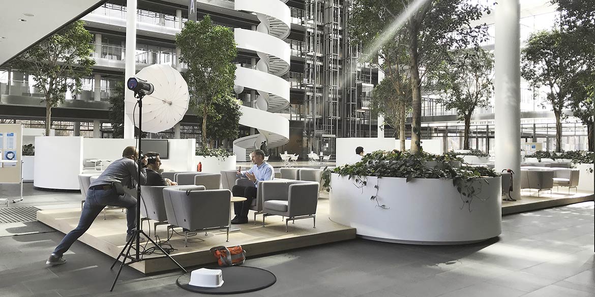 Gleich vier Tage waren angesetzt für eine Gruppenaufnahme und Einzelportraits der Vorstände eines unserer Stammkunden. Die sich verändernde Unternehmenskultur sollte in den neuen Portraits sichtbar werden, die Aufnahmen also lockerer aussehen als bisher. Das neu gestaltete Atrium mit viel Grün und verschiedenen „Inseln“ zum Sitzen, Arbeiten und für Gespräche bot hierfür die perfekte Kulisse. Eine dieser „Inseln“ durften wir nutzen, um dort unseren Laptop-Arbeitsplatz und das Make-up einzurichten.