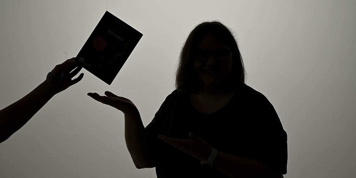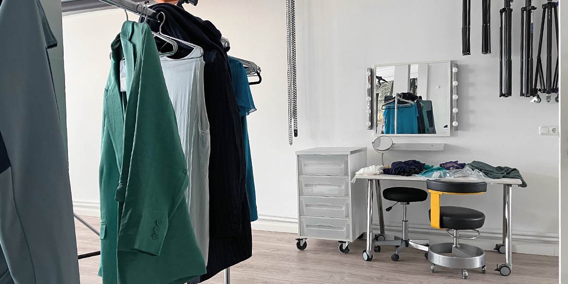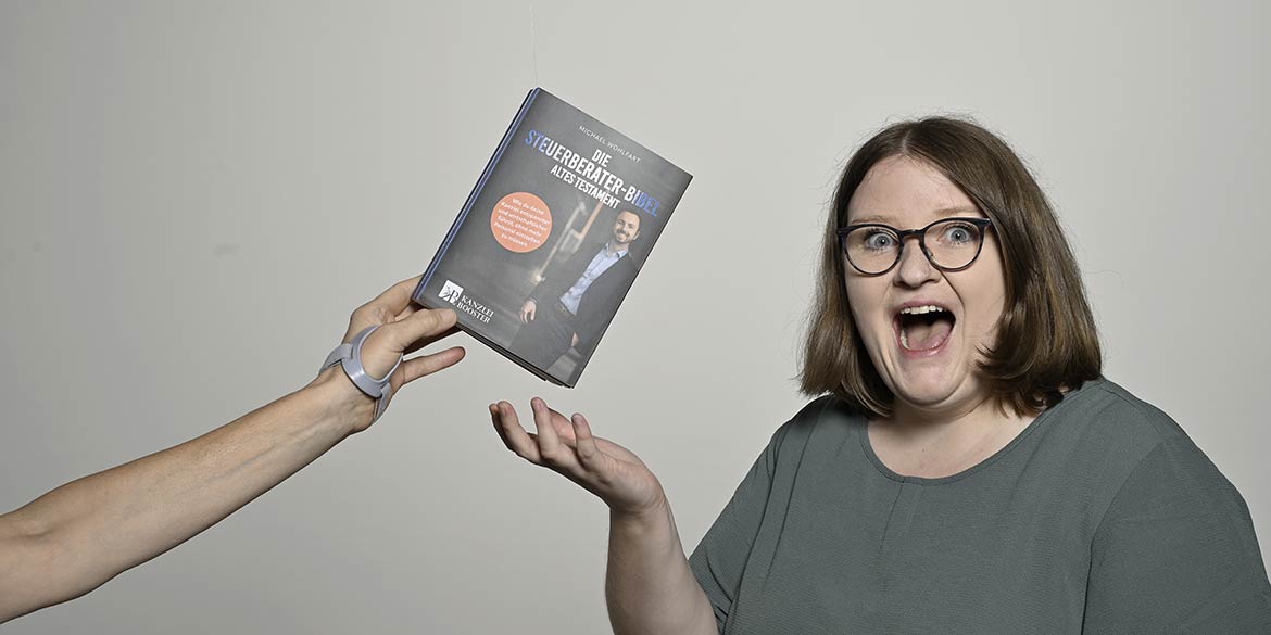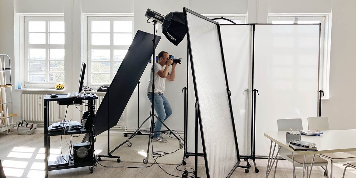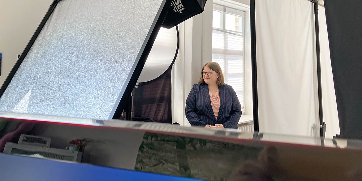 Zum Termin brachte Kia nicht nur gute eigene Ideen mit, sondern auch einen ganzen Koffer voller Bücher und Outfits. Im bereits von uns vorbereiteten Set entstand sitzend am Tisch die erste Aufnahme „die Bücherfachfrau – kompetent und sympathisch“. Für das zweite Motiv baute Daniel mit Reflektorwänden ein eigenes Set ins Studio. Hier lehnte sich Kia locker an die Wand für „die Geschäftsfrau – souverän entspannt“. Und weil aller guten Dinge bekanntlichermaßen drei sind, haben wir dann noch „die Zauberin – lässt Bücher lässig schweben“ fotografiert.