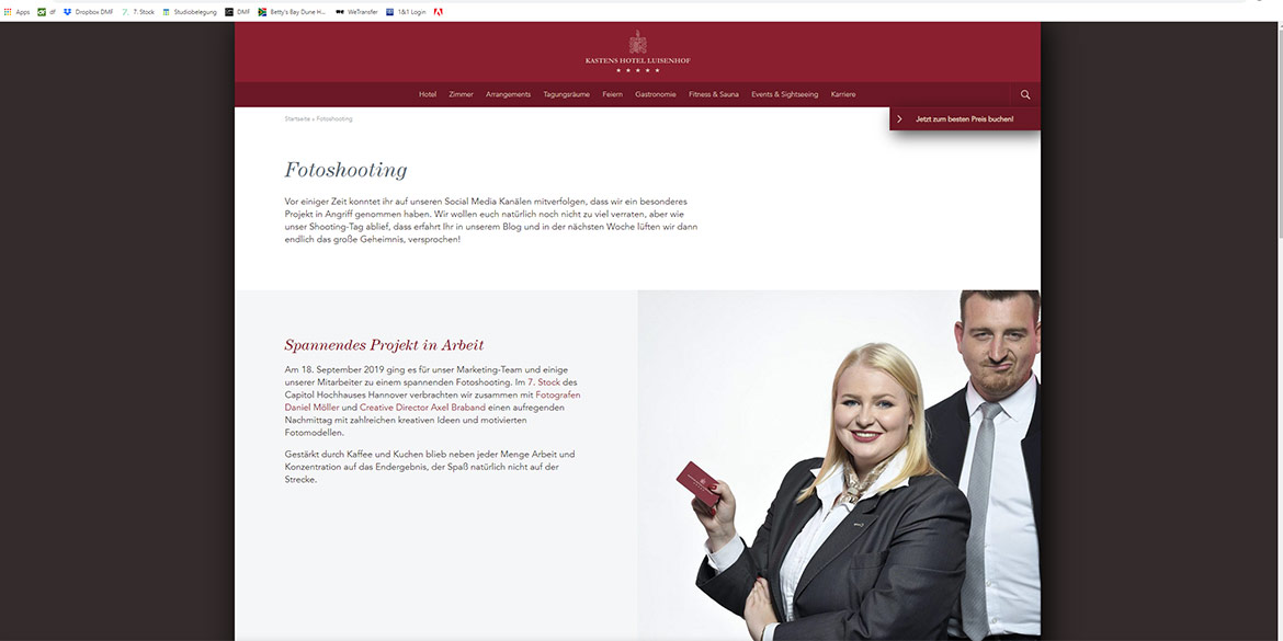 Ein außergewöhnlicher Arbeitstag für das Marketing-Team und einige der Mitarbeiter des Kastens Hotel Luisenhof: sie wurden als Markenbotschafter, stellvertretend für die jeweilige Abteilung im Hotel, in unterschiedlichen Posen in unserem Studio abgelichtet. Wie der Shooting-Tag ablief, sieht man im Blog des Hotels. Nun sind wir voller Vorfreude auf das Ergebnis, das noch diese Woche veröffentlicht werden soll.