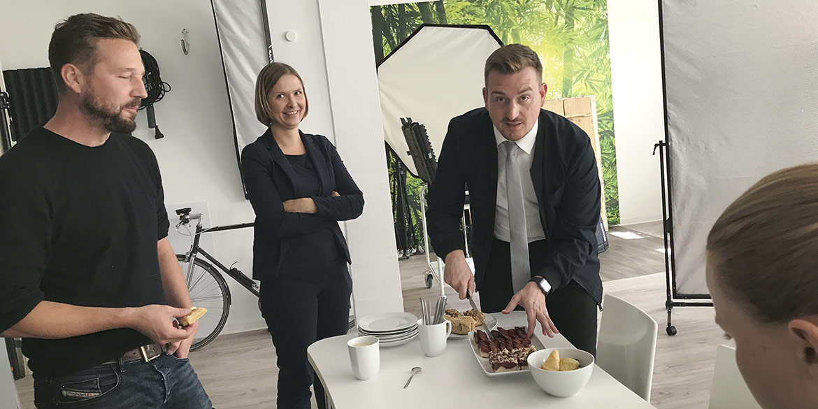 Vor Beginn des Shootings rüsteten wir uns mit Falafel-Rollen und Kuchen aus, um den Gästen einen warmen Empfang zu bereiten. Die Falafel-Rollen allerdings für Lisa und Daniel (Pech lieber Kunde, wenn man viel zu früh eintrifft ;-)), nur der Kuchen für den Kunden. Dieser teilte dann auch schon kurz nach seinem Eintreffen den Kuchen in kleine Stücke auf, um dem Futterneid selbsttätig entgegenzuwirken.