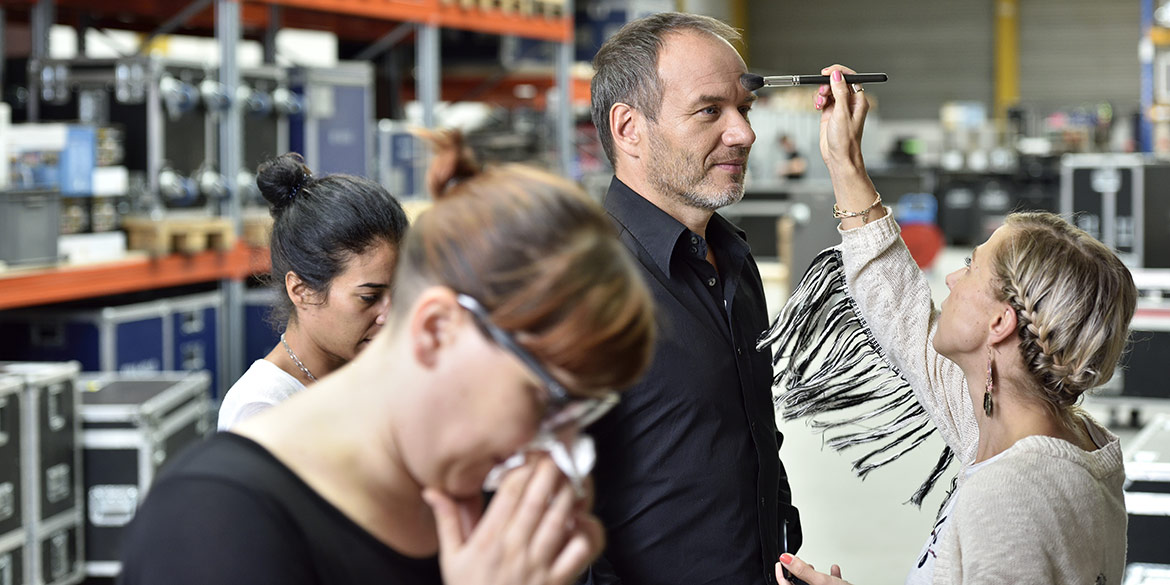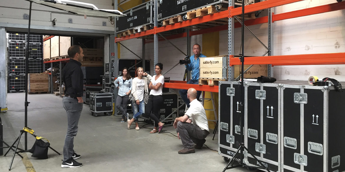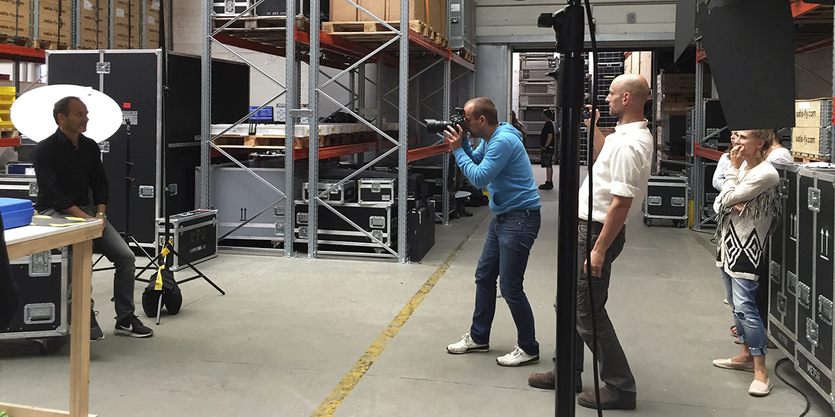 Vor Ort war dann Marvin von der satis&fy AG eine sehr große und unverzichtbare Hilfe, denn er besorgte Requisiten und räumte so engagiert wie gelassen und schuf so die perfekte Kulisse. Am ersten Shootingtag wurde Modell Adam in eher cooler, dunkler Stimmung buchstäblich in Szene gesetzt, tatkräftig unterstützt von Stylistin Selma und Make-up-Artistin Manuela. Am zweiten Tag war dann Modell Frank (ebenso wie Adam von Izaio Management) an der Reihe. Diesmal war der Hintergrund ein Hochregallager in heller Atmosphäre und auch hier gilt unser Dank dem unermüdlichen Marvin.