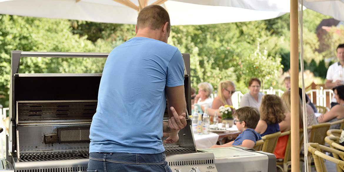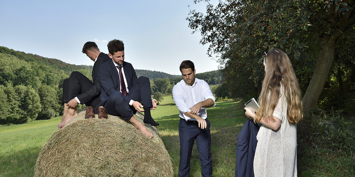 Für ein Motiv auf der grünen Wiese kamen dann noch drei Bekannte der Hoteleigentümer als Modelle ins Spiel, die trotz der unsäglichen Hitze „ganz brav“ im Anzug auf ihren Einsatz warteten. Es musste nämlich noch ein Heuballen als Sitzgelegenheit organisiert werden, was aber – ganz typisch für die ländliche Gemeinschaft – schnell mit einem kurzen Telefonat erledigt werden konnte. Prompt wurde der Ballen mit dem Trecker rangekarrt und es konnte losgehen. Obwohl das Set im gefühlten Nirgendwo lag, kamen einige Autos vorbei, und so hatten wir sogar Zuschauer, die sich offensichtlich freuten, dass es mal etwas Außergewöhnliches zu sehen gab.