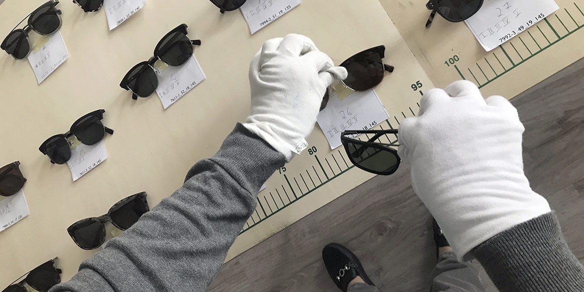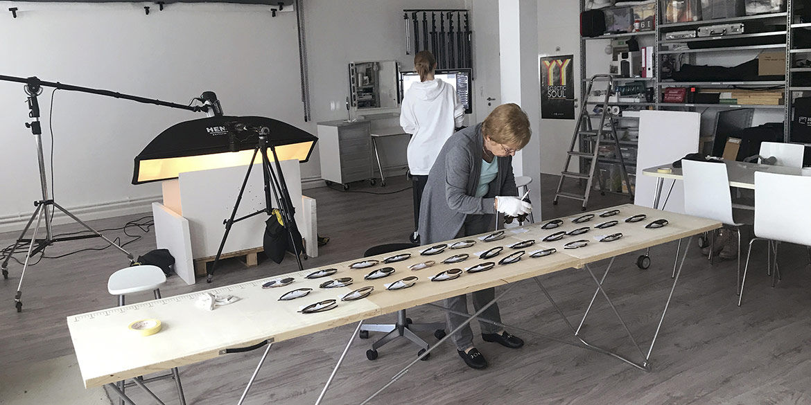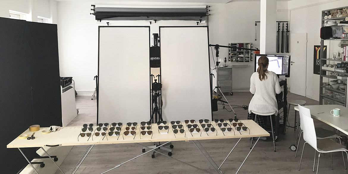 Vorbereitet und motiviert starteten Daniel und Auszubildende Lisa an einem Montagmorgen das Shooting im Studio. Zuerst wurden die Sonnenbrillen nach Seriennummer auf dem Tapeziertisch sortiert und fotografierbereit platziert. Arbeitsaufteilung: Daniel war für das Platzieren im Set und Fotografieren zuständig, Lisa für den Überblick, das Kontrollieren und die ganze Dateiverwaltung. Am Ende des ersten Shooting-Tags waren zwei Perspektiven geschafft.