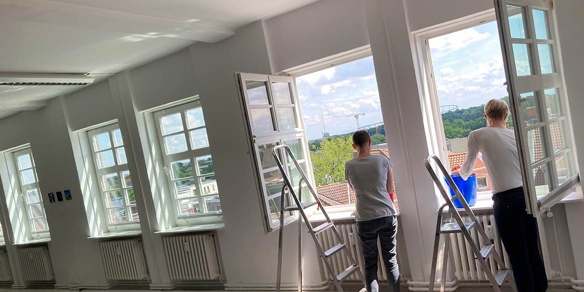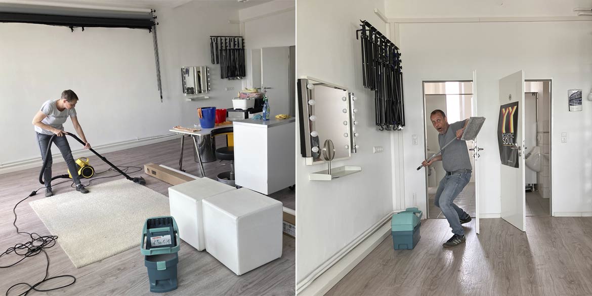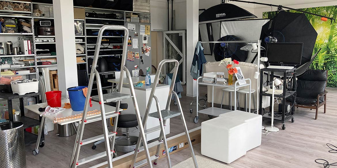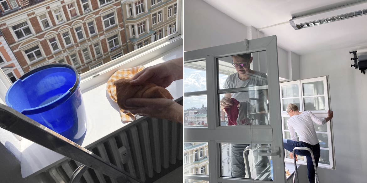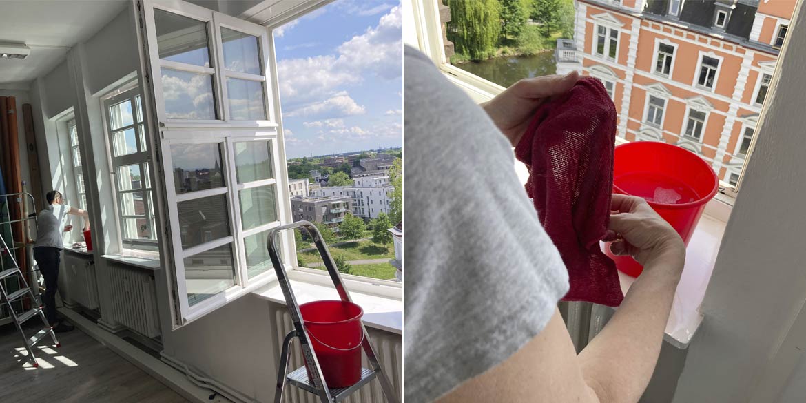 Es war wirklich mal wieder dran, aber so richtig Lust hatten wir (nicht alle schwindelfrei) nicht, die Studio-Fenster im 7. Stock zu putzen. Bis eine gute Freundin meinte, das ginge jetzt nicht mehr, und erfreulicherweise direkt ihre Hilfe anbot. Die haben wir sehr gerne angenommen und gleich insgesamt einen verspäteten Frühjahrsputz daraus gemacht: als erstes alles von den Wänden gerückt und in der Studiomitte zusammengeschoben, dann die Fenster gewienert und anschließend unter-hinter-neben allem durchgefeudelt, wo man sonst beim Putzen nicht so oft hinkommt. Erstaunlich, wie viel „Gedöns“ wir eigentlich haben, wo es doch sonst eher leer aussieht.