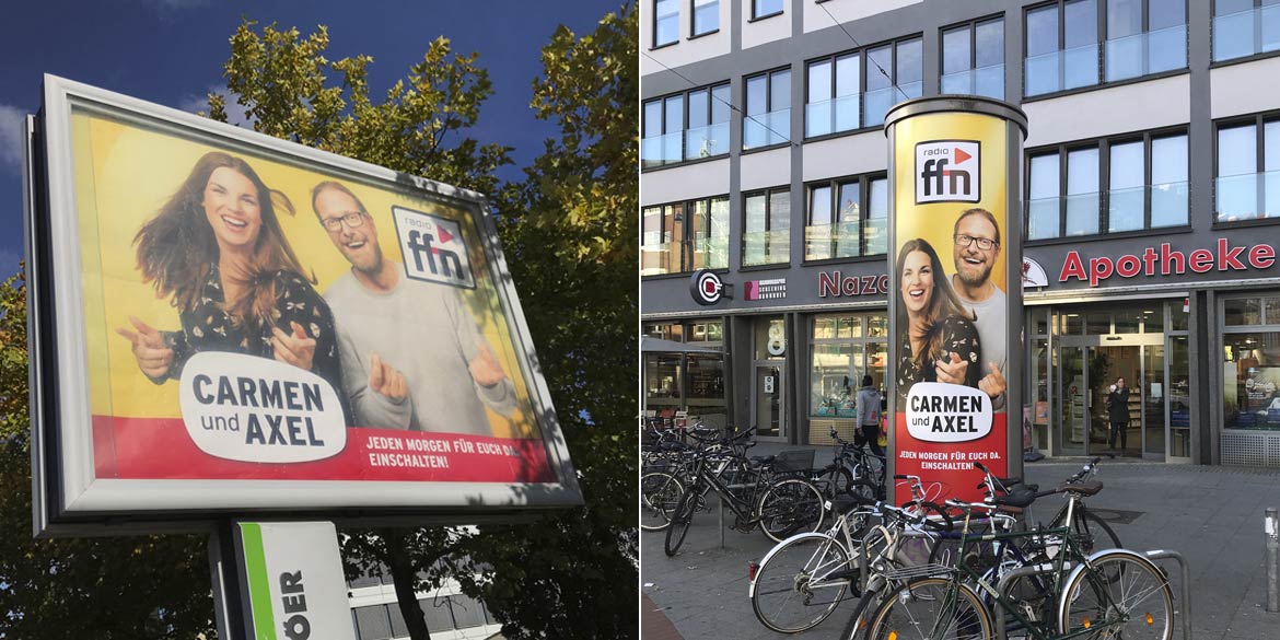 Auch in diesem Herbst ist Hannover mit „unseren“ ffn-Motiven wieder gut bestückt. Die Guten-Morgen-Macher Carmen und Axel lachen von allen möglichen Plakaten und Litfaßsäulen und verbreiten gute Laune in der Stadt. Die steckt dann auch uns an, wenn wir dran vorbeikommen.