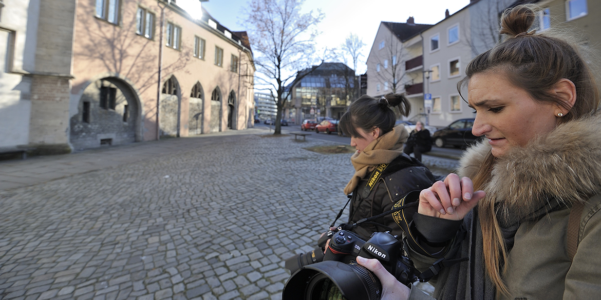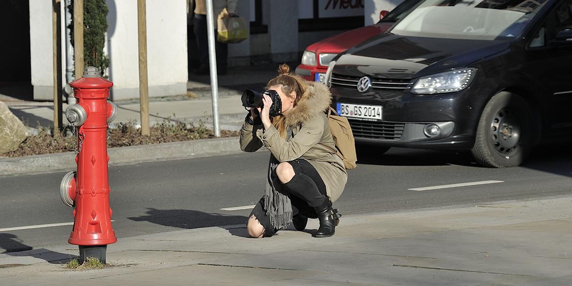 Um verschiedene fotografische Themen inhaltlich abzudecken, klapperten wir unterschiedliche Locations ab. Erster Standort war eine Kirche, an der geübt wurde, den richtigen Standpunkt und Blickwinkel zu finden. Weiter ging es an eine viel befahrene Straße, an der unsere Teilnehmerinnen sowohl übten, bei bewegten Motiven die Kamera mitzuziehen, also auch, bewegte Objekte vor einem scharfen Hintergrund gezielt verwischen zu lassen.