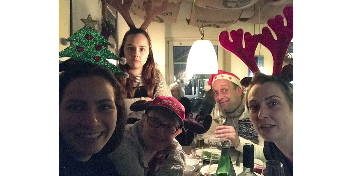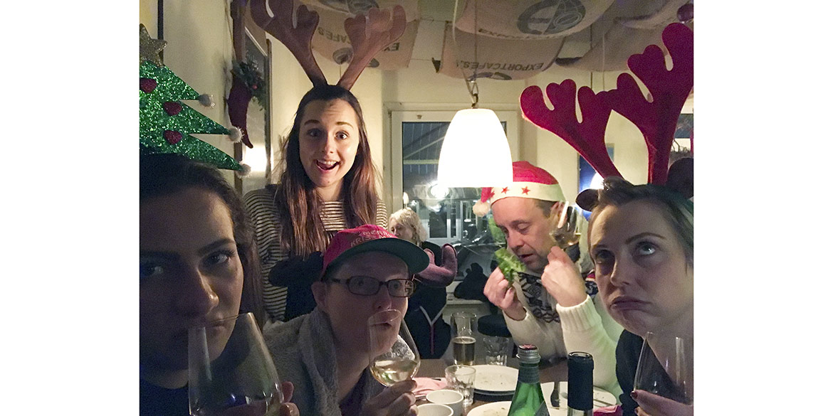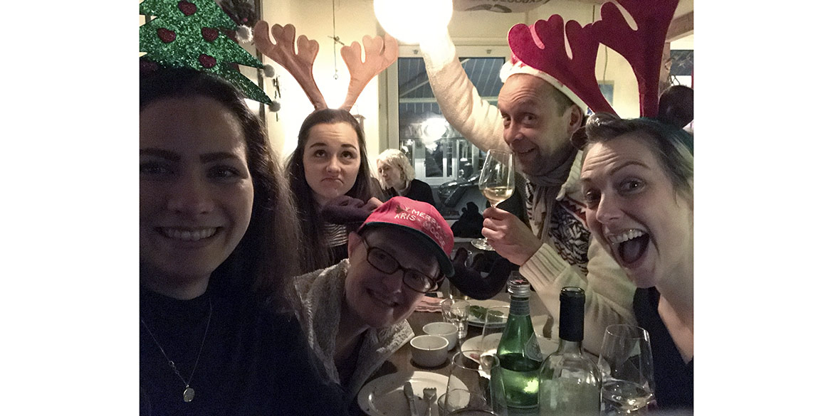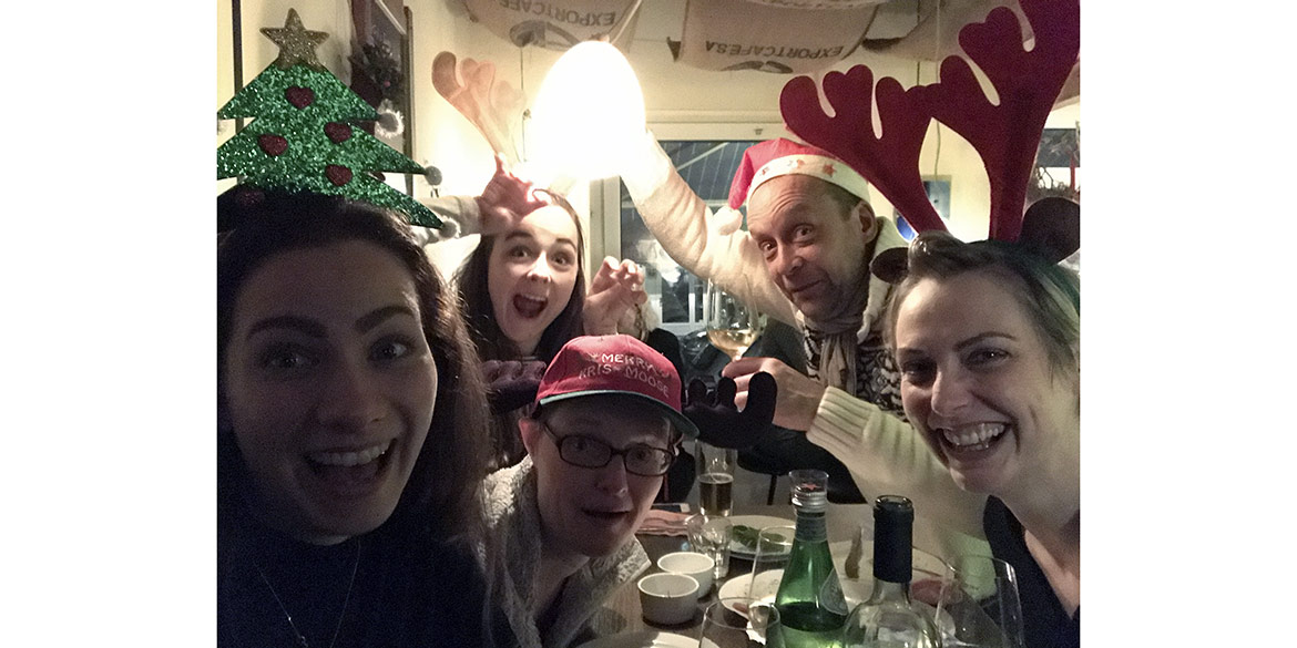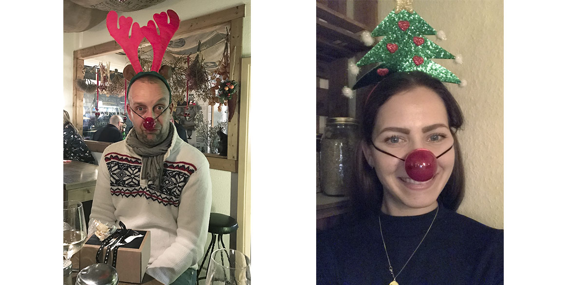 Tradition ist Tradition! Also war schon lange vor Weihnachten ein Termin für den Jahresausklang auf dem Weihnachtsmarkt gefunden. Dieses Mal gab es jedoch noch eine zusätzliche Herausforderung für uns alle. Daniel fühlte sich als Teamchef berufen, eine neue „Regel“ einzuführen: alle sollten sich eine schrecklich-kitschige Kopfbedeckung zulegen und diese auch den ganzen Abend tragen. Je mehr Glühweinrunden geschafft waren, desto einfacher war dies für die meisten zu ertragen. Sandra hatte zwischendurch ihren etwas ungewöhnlichen Kopfschmuck schon ganz vergessen und wurde erst beim Gang zur Toilette daran erinnert, als ein Mädchen zu ihrer Mutter sagte: „Oh schau mal, ein Tannenbaum“.