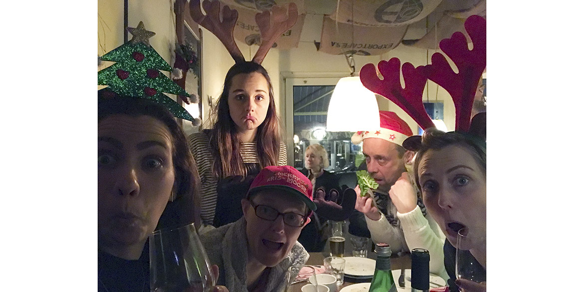 Mona als Rentier, Daniel als Santa, Stefanie als Elch, Sandra als Tannenbaum und Kristina als Rentierkalb